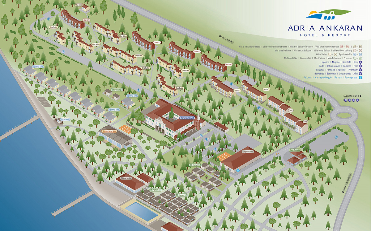jedná se o rozlehlý resort, jehož součástí je hotel Convent (v bývalém klášteře), rodinné pokoje Suites Olive , pokoje ve třípodlažních vilách Adria (92 pokojů), přízemní apartmány a prémiové mobilhomy Adria (18 apartmánů a 43 prémiových mobilhomů) a kemp; stravování a další služby jsou v hlavní budově hotelu Convent