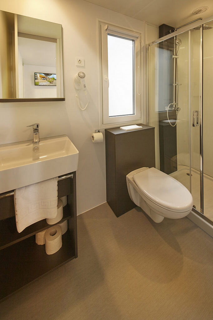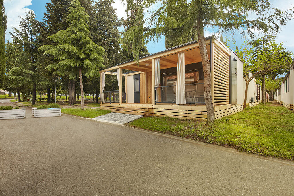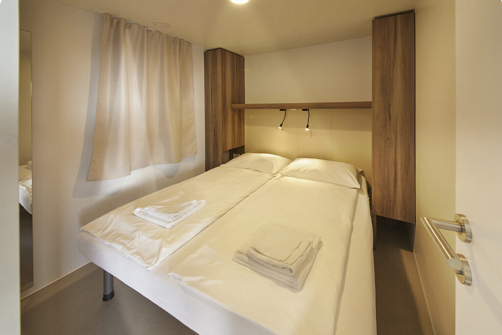 20 m² + 10 m² terasa - mobilní domy pro 2 osoby – 1 ložnice s manželskou postelí, sociální zařízení se sprchou / WC, terasa