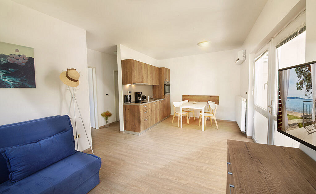 přízemní apartmán – 1 ložnice s manželskou postelí, obytná místnost s kuchyňským koutem, jídelnou a rozkládací pohovkou až pro 2 osoby, sociální zařízení, terasa