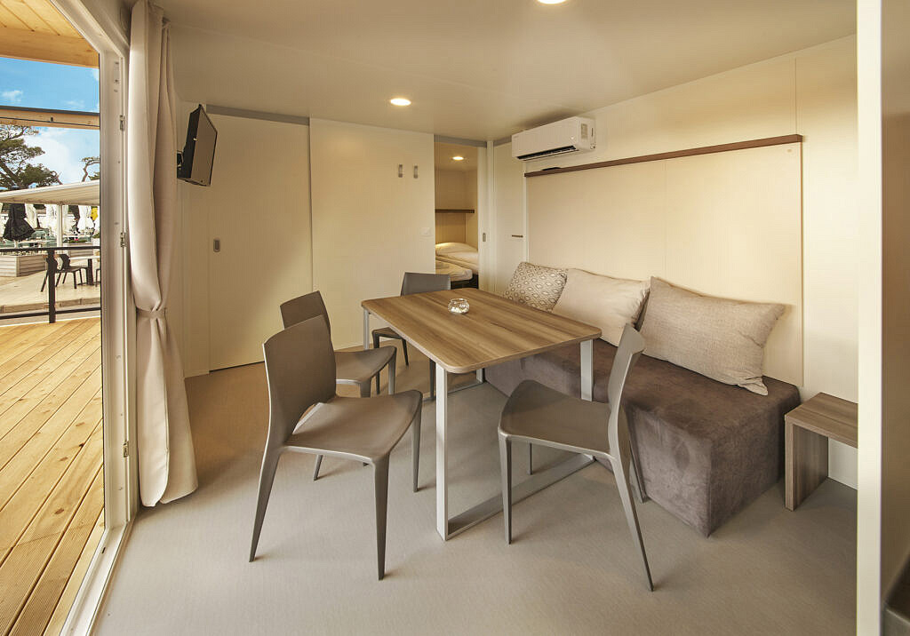 34 m² + 12 m² terasa - 1 ložnice s manželskou postelí, 2 ložnice s 2 oddělenými lůžky, obývací pokoj s kuchyňským koutem, sociální zařízení se sprchou, zpravidla oddělené WC, terasa