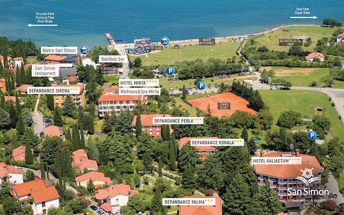 resort se skládá ze dvou hotelů (Mirta**** a Haliaetum****) a několika depandancí (Palma***, Korala***, Perla*** a rekonstruovaná Sirena***)