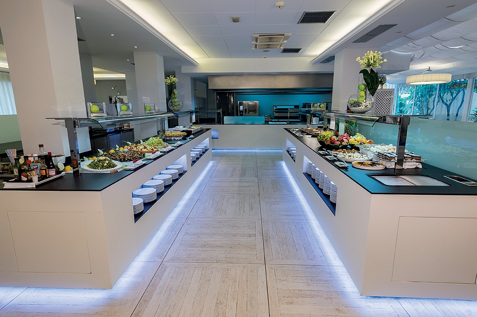 formou bohatého mezinárodního bufetu; nápoje za poplatek