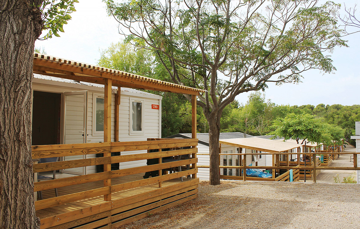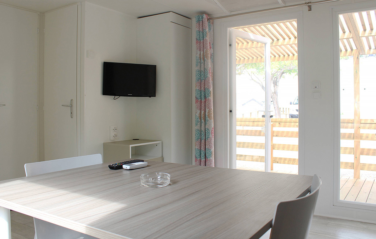 50 m² - ložnice s manželskou postelí, 1 ložnice se 3 samostatnými lůžky, obytná část s kuchyňským koutem a rozkládacím gaučem pro 1 osobu, 2x sociální zařízení se sprchou, částečně krytá dřevěná terasa
