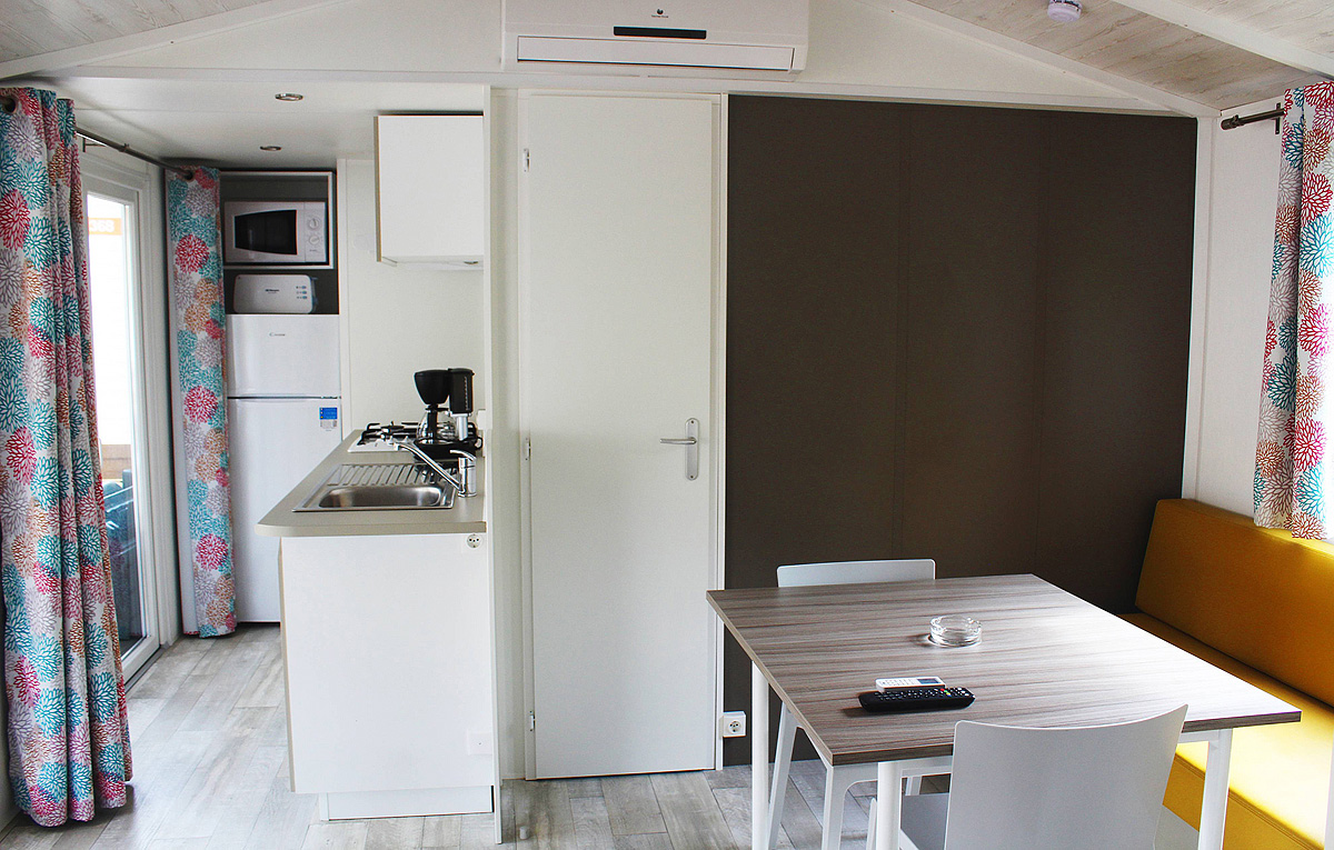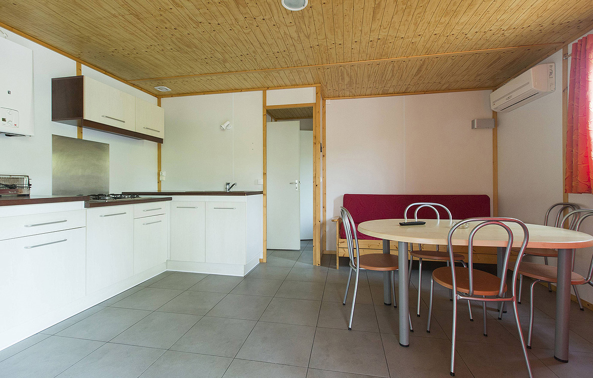 50 m² - 1 ložnice s manželskou postelí, 1 ložnice se 2 samostatnými lůžky, obytná část s kuchyňským koutem a rozkládacím gaučem pro 2 osoby, sociální zařízení se sprchou, částečně krytá dřevěná terasa