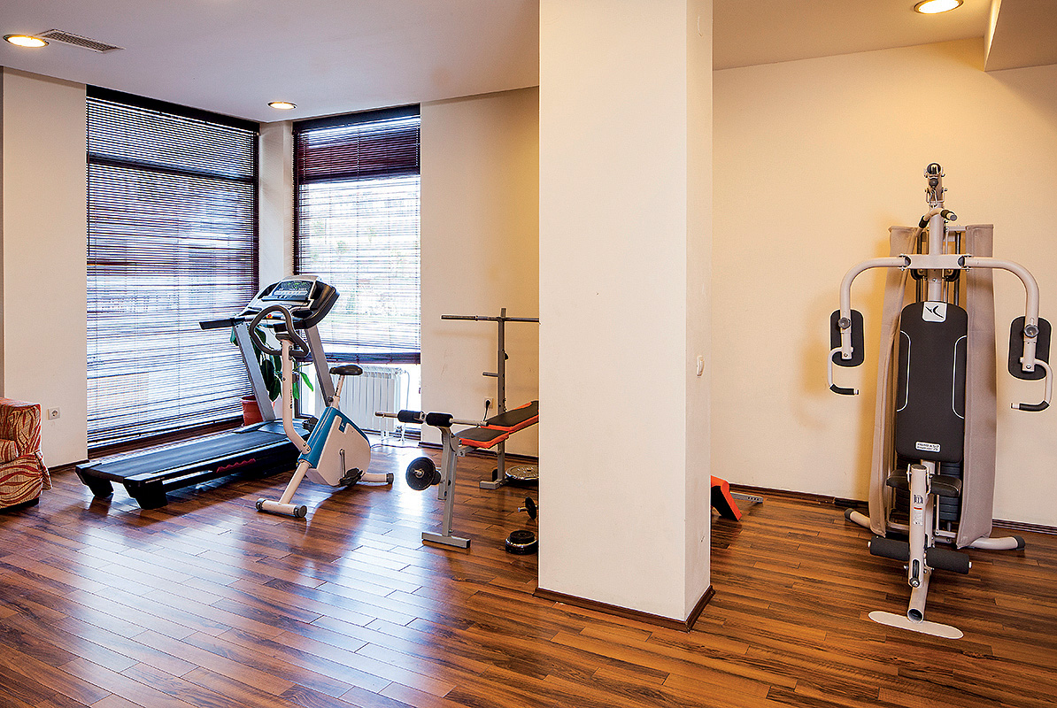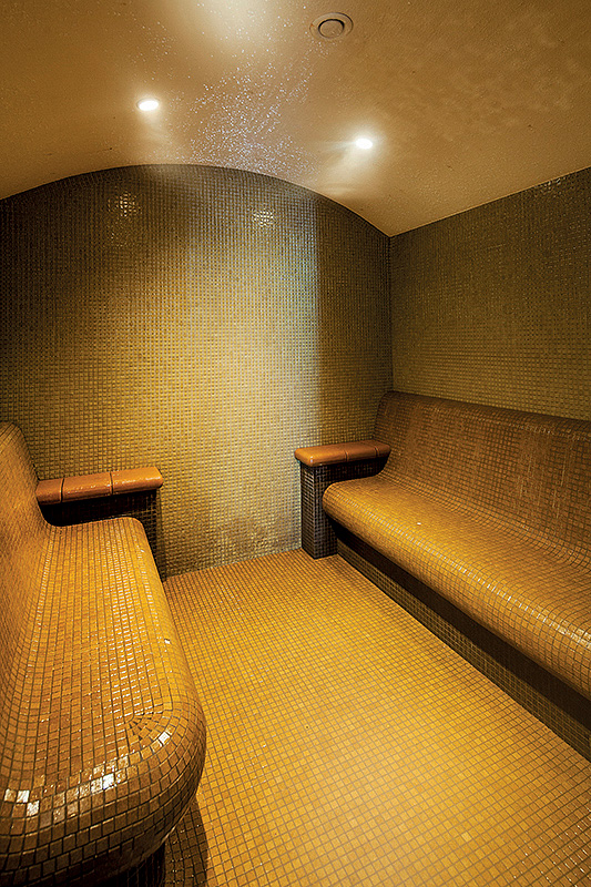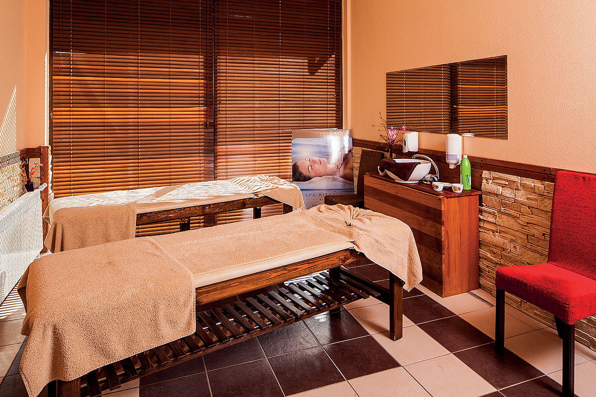 bazén s dětským bazénkem s vodními tryskami a lehátky, vířivka, sauna, infrasauna, pára*, multifunkční sprcha, relaxační koutek s vyhřívanými vodními lůžky, masáže*, kosmetické služby*, kadeřnické služby*, posilovací koutek, stolní tenis*
