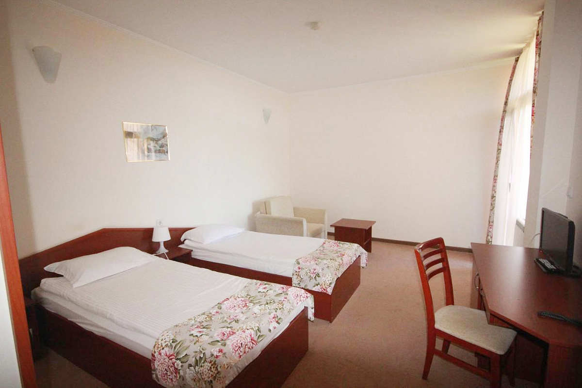 pokoj s manželskou postelí či 2 samostatnými lůžky a případně rozkládacím křeslem na lůžko pro 1 dítě do nedovršených 12 let, sociální zařízení zpravidla s vanou; některé s balkonem