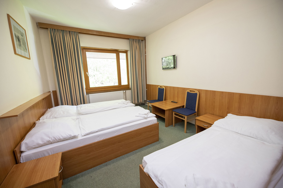 Standard 3 - 23 m² - pokoj s manželskou postelí se zpravidla oddělitelnými lůžky a 1 samostatným lůžkem, sociální zařízení se sprchou
