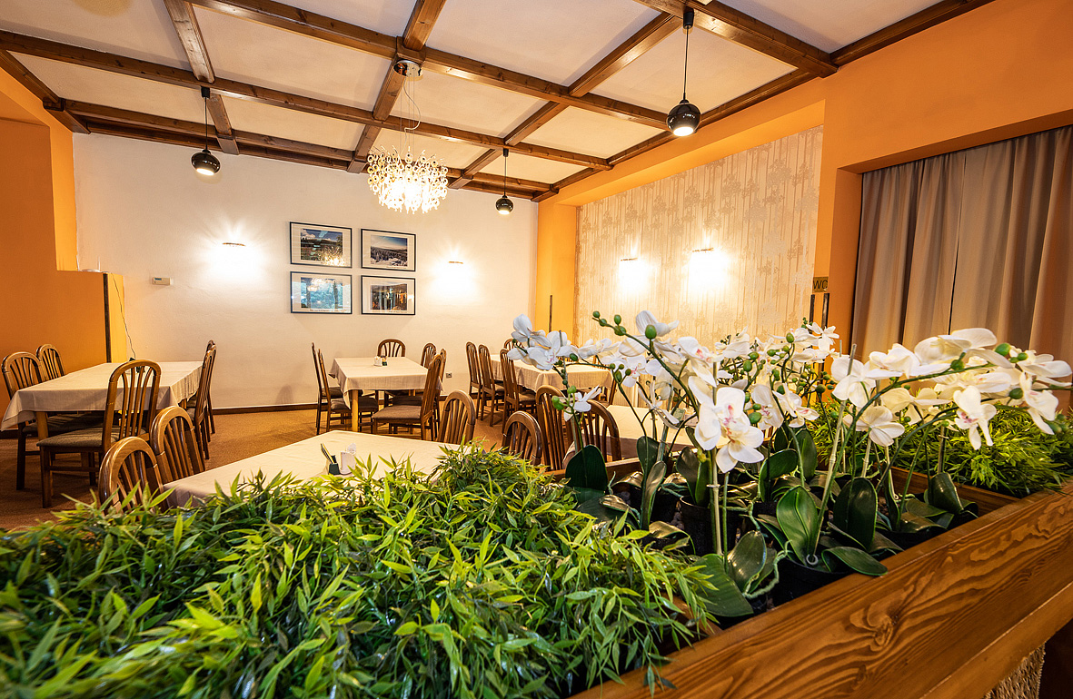 večeře (za příplatek) - servírované menu s výběrem ze 3 hlavních jídel, polévka, salát nebo kompot, nápoje za poplatek