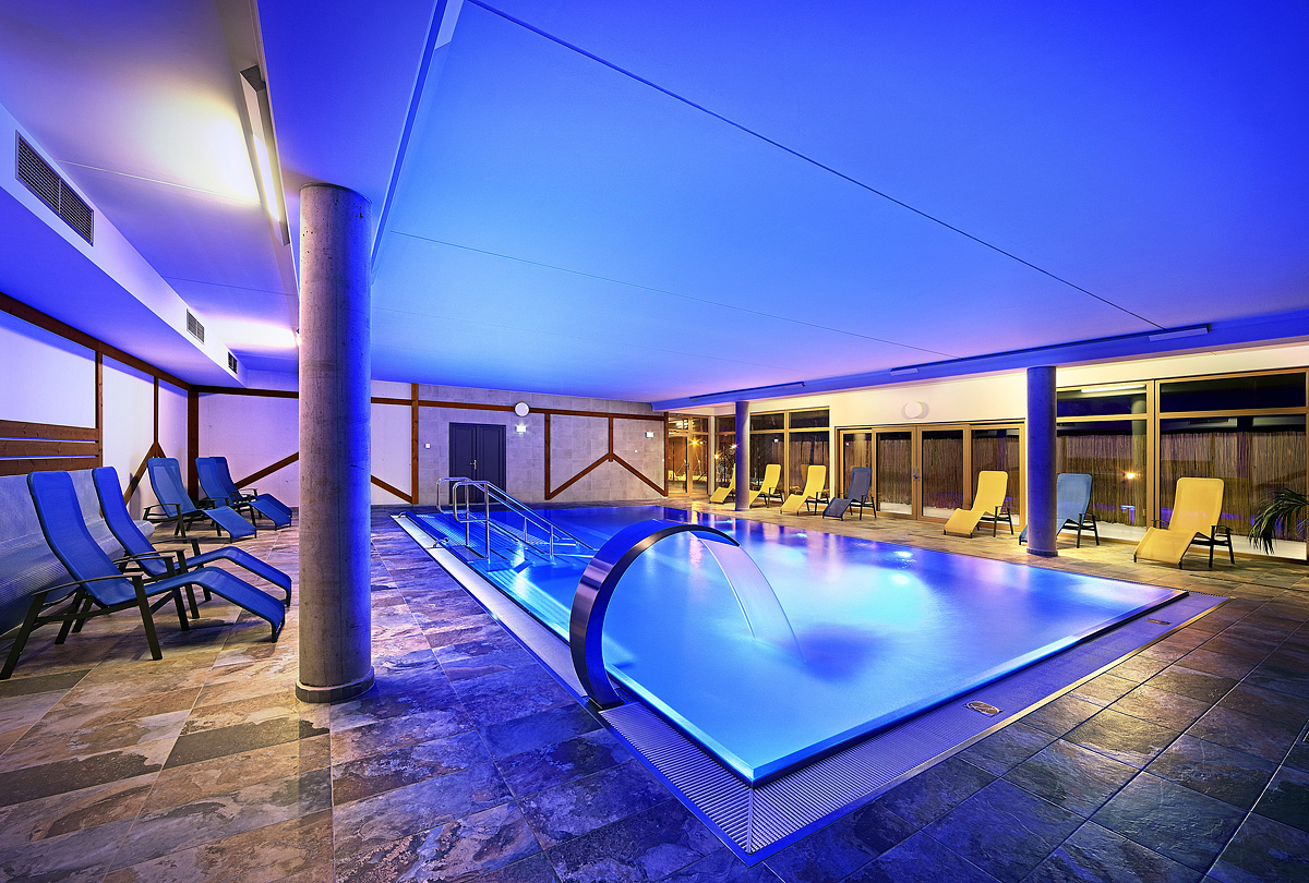 krytý bazén 60 m² s lehátky (zdarma 1 hod. / den, další vstupy za poplatek), venkovní vířivka* až pro 8 osob, finská sauna, biosauna a pára (zdarma 1 hod. / den, další vstupy za poplatek), ledová lázeň, multifunkční sprcha, relaxační koutek s lehátky, privátní wellness* (s vířivkou, finskou saunou a odpočinkovou místností s TV), masáže*