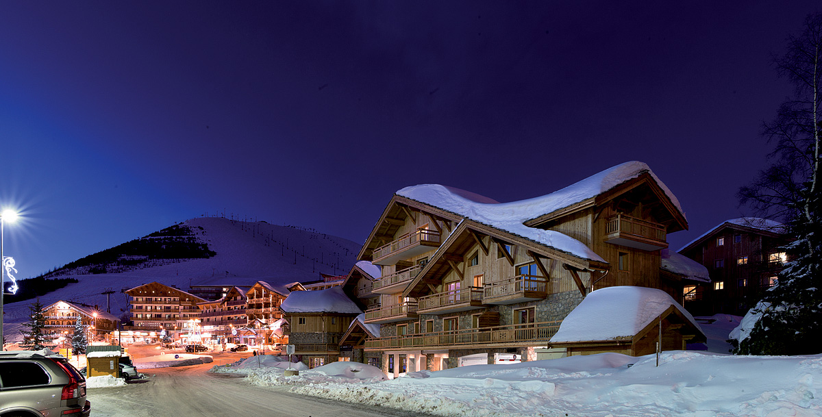 Alpe d'Huez - lokalita Cognet, centrum lokality Cognet, resp. Alpe d'Huez Jeux - 0 m, resp. 50 m, skiareál Alpe d'Huez - 100 m