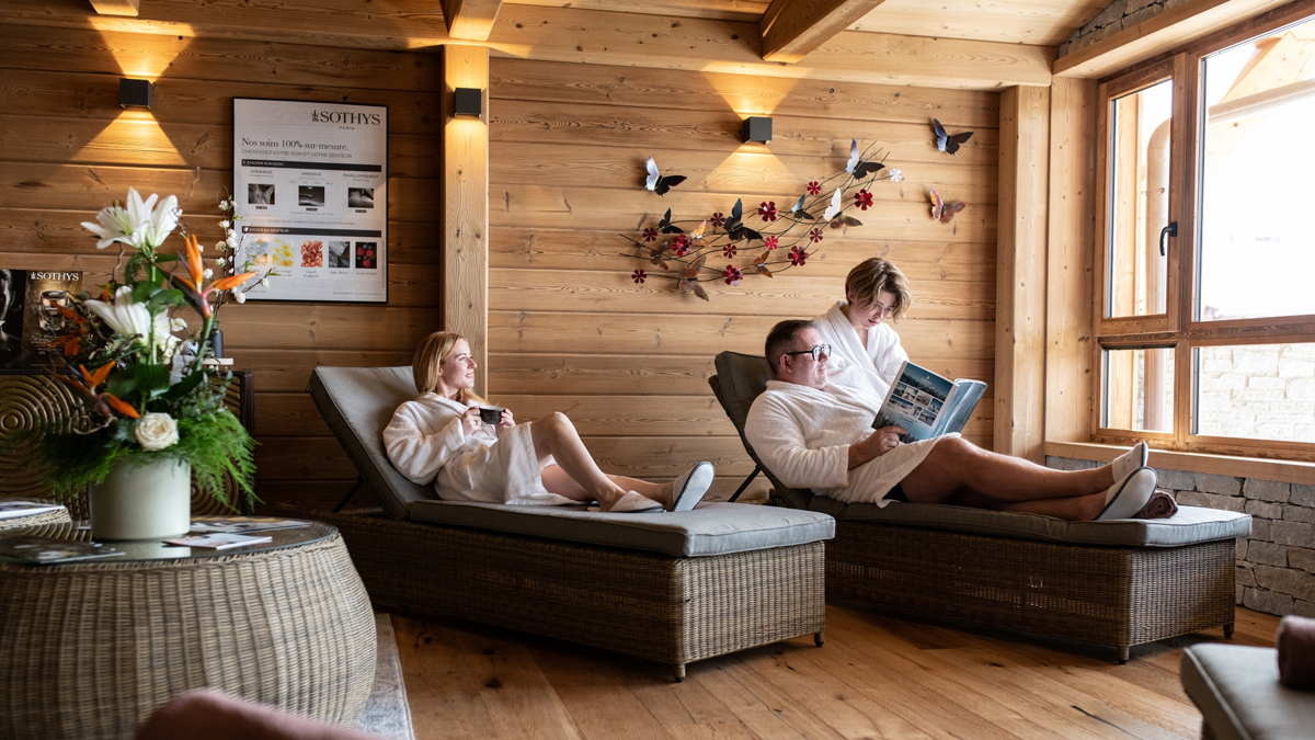 vnitřní a venkovní vyhřívaný bazén, dětský bazének, vířivka, sauna, pára, solná jeskyně, fitness, masáže* a kosmetické služby* (v rámci spa centra Ô des Cimes); vstup do wellness centra od 16 let