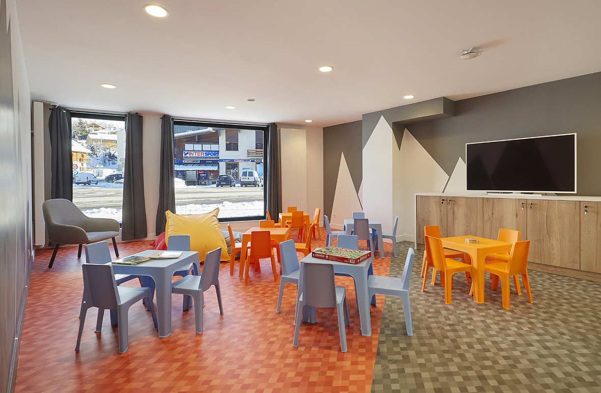 recepce / velká lobby s TV a krbem, úschovna lyží, výtah, garážová stání* (výška vjezdu 195 cm; počet míst omezen; rezervace nutná předem; úhrada garáže je povinná), pračka*