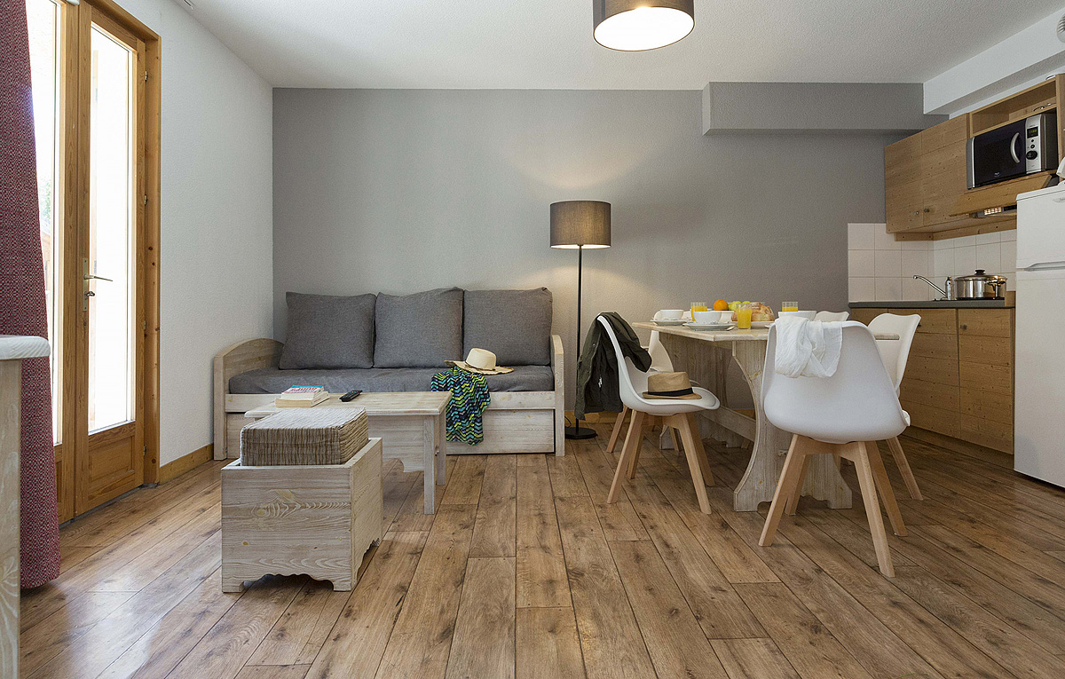 35 m² - 1 ložnice s manželskou postelí či 2 samostatnými lůžky, 1 ložnice s palandou či 2 samostatnými lůžky, obývací pokoj s kuchyňským koutem a rozkládacím gaučem pro 2 osoby (možno i typ „šuplík“), sociální zařízení se sprchou či vanou (oddělené WC), terasa; některé apartmány jsou dvoupodlažní