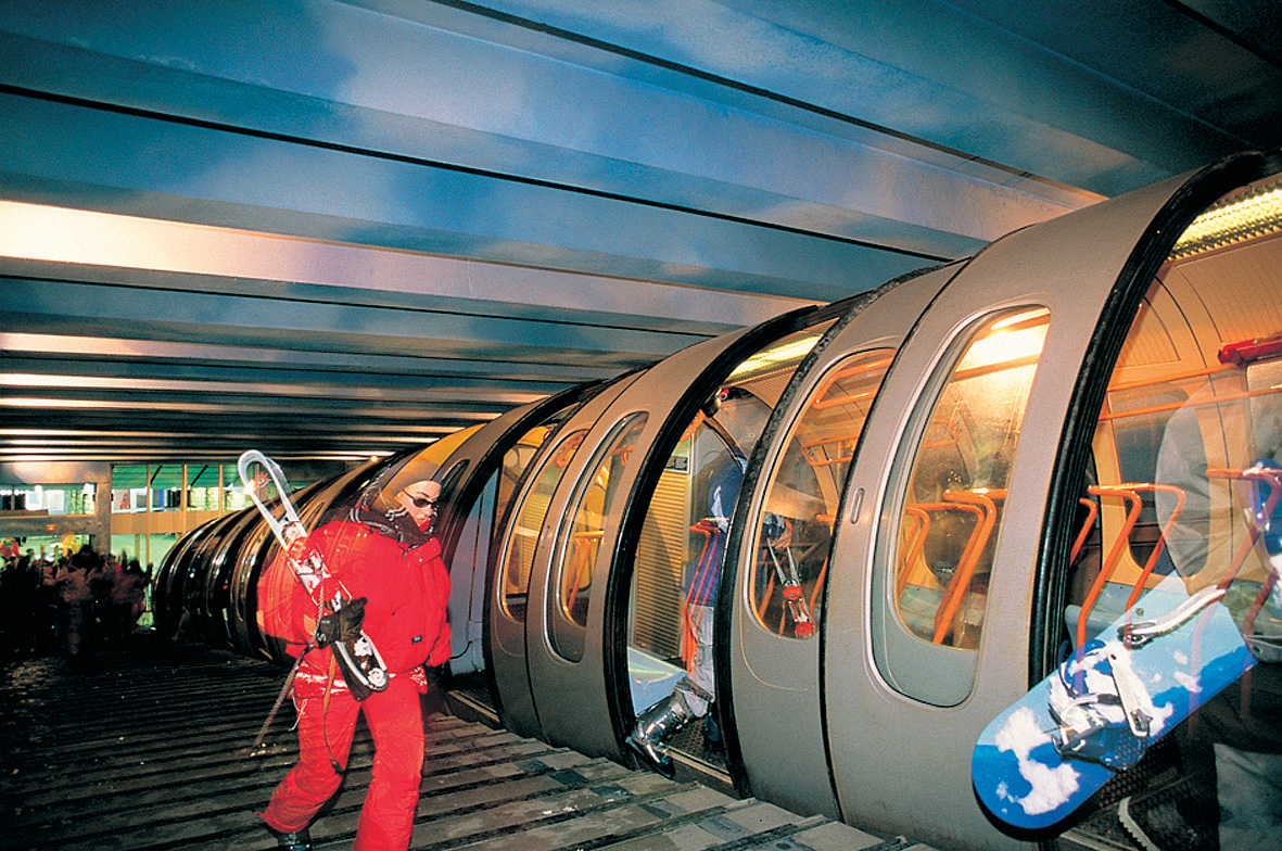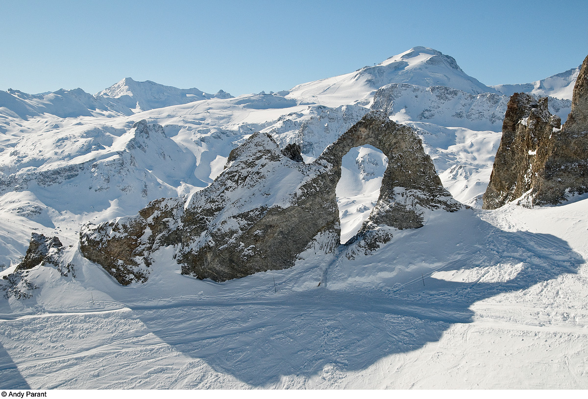 Během pouhých 6 minut vás vyveze podzemní lanovka z 2.100 m na ledovec La Grande Motte až do výšky 3.456 m. Odtud máte celé údolí jako na dlani a průrvou mezi skálami vidíte část trasy, kterou jste přijeli, včetně jezera v Tignes le Lac. Při pozorném pohledu na skalní masiv vlevo nad jezerem rozeznáte další dominantu střediska Tignes, skálu ve tvaru ucha jehly – Aiguille Percée (2.748 m). Jen stěží koupíte v Tignes pohlednici, kde by tento zvláštní skalní útvar nebyl zachycen.