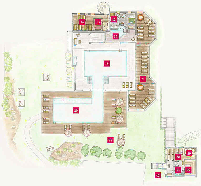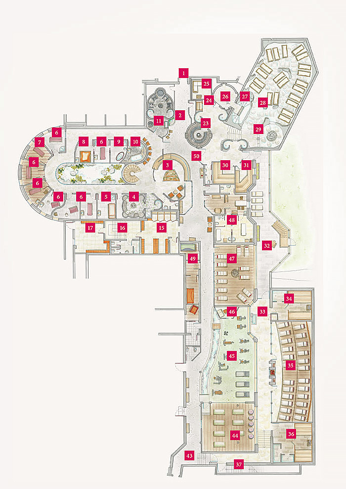 bazén 14 x 10 m, venkovní vyhřívaný bazén 12 x 8 m s vířivkou, dětský minibazén, 4x sauna#, panoramatická sauna#, pára#, infrakabina#, ledová lázeň#, sirná jeskyně#, sirné prameny#, horizontální solárium#*, 5x relaxační koutek# s lehátky, relaxační koutek# s lehátky a krbem, Kneippův chodník#, masáže#*, kosmetické služby#*, posilovna#; služby označené # nemohou využívat děti do 12 let; v rámci relaxačního centra jsou zdarma nabízeny též bylinkové čaje