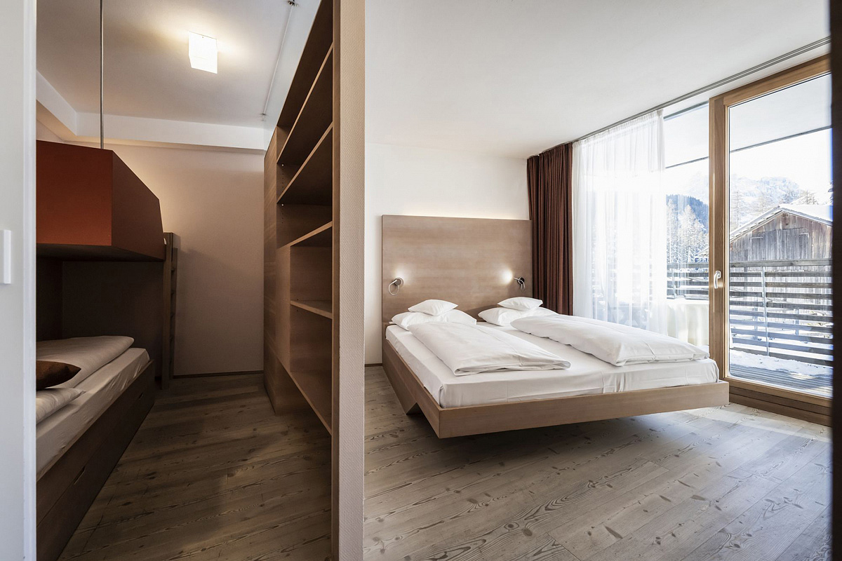 trilo 2+3 Tassilo Family - 55 m² - 1 ložnice s manželskou postelí, 1 ložnice se 2 samostatnými lůžky, obývací pokoj s kuchyňským koutem a rozkládacím gaučem pro 1 osobu, sociální zařízení se sprchou či vanou, balkon; maximální obsazenost apartmánu jsou 2 dospělé osoby a 3 děti do nedovršených 18 let