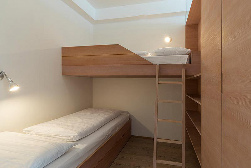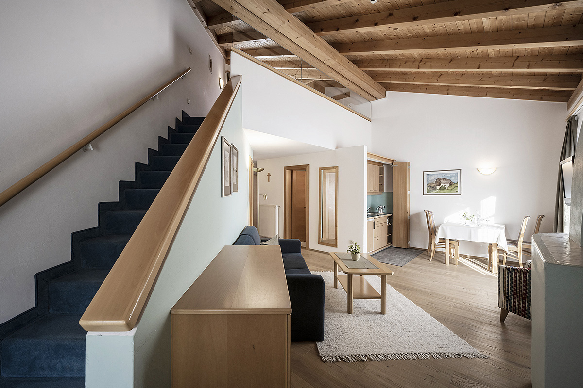 bilo 2+2 Turmstube - 50 m² - 1. podlaží: obývací pokoj s kuchyňským koutem a rozkládacím gaučem pro 2 osoby, sociální zařízení se sprchou či vanou, balkon; 2. podlaží: 1 ložnice s manželskou postelí, balkon; maximální obsazenost apartmánu jsou 2 dospělé osoby a 2 děti do nedovršených 18 let