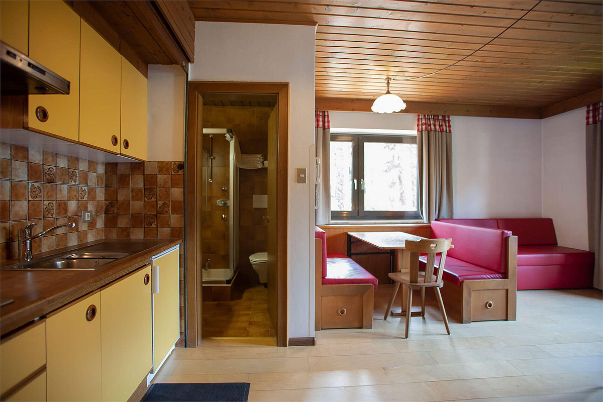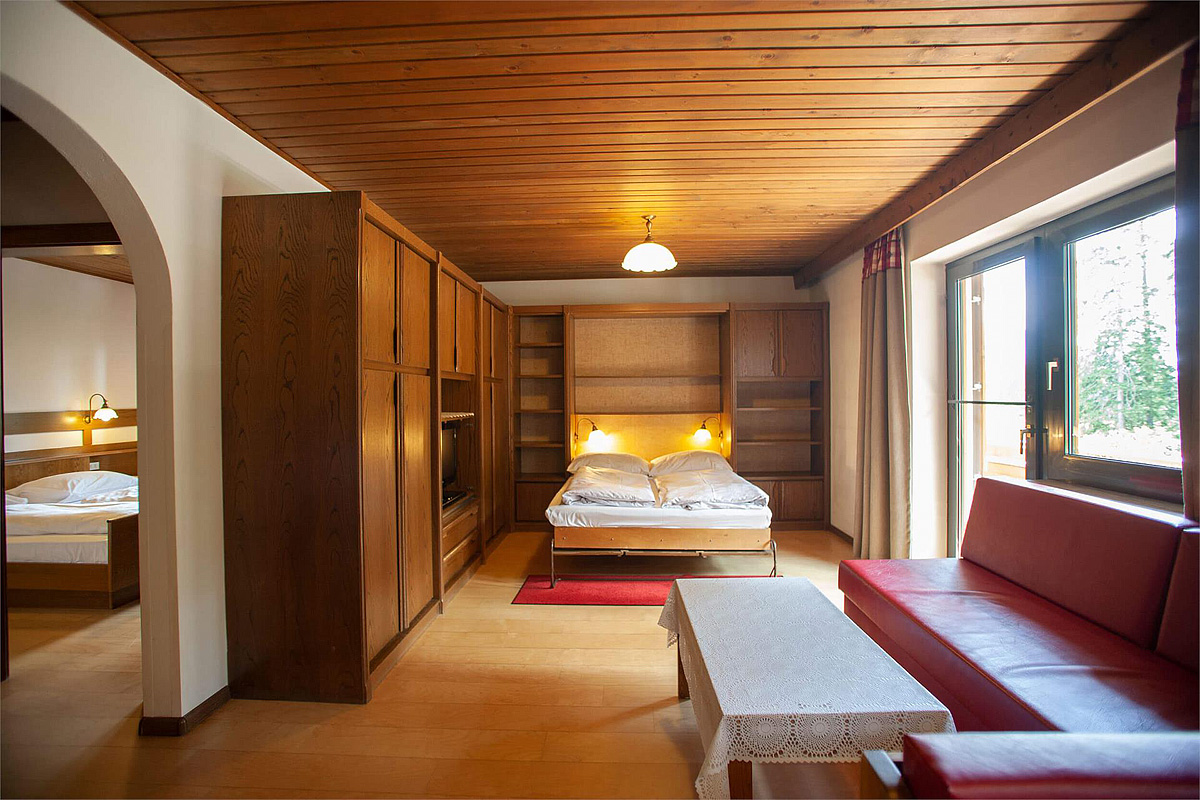 bilo 5 Drei Zinnen - 45 m² - 1 ložnice s manželskou postelí, obývací pokoj s kuchyňským koutem, skříňovou manželskou postelí a 1 dalším samostatným lůžkem či rozkládacím gaučem pro 1 osobu, sociální zařízení, balkon či terasa