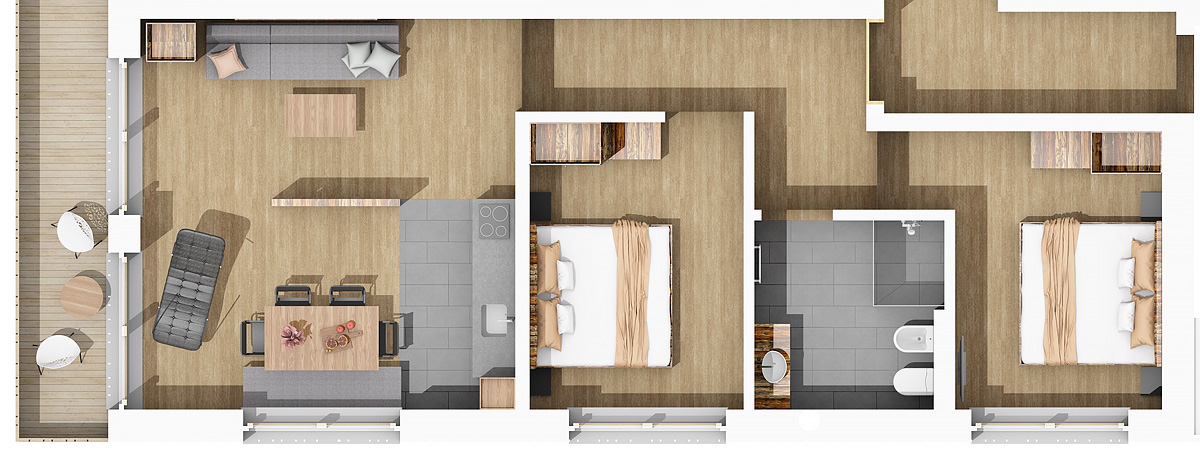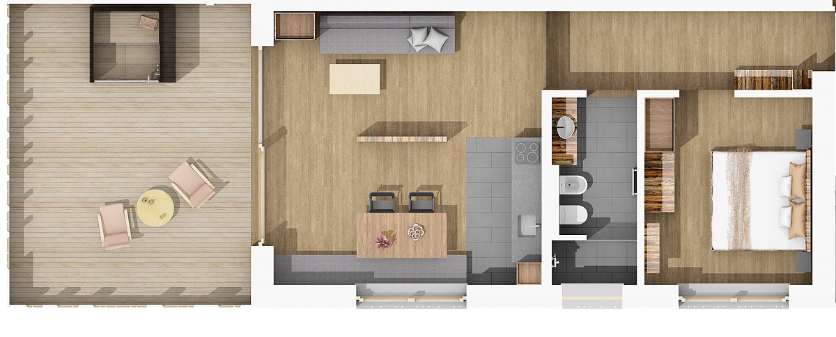 65 m² - - 2 ložnice s manželskou postelí, obývací pokoj s kuchyňským koutem a rozkládacím gaučem pro 2 osoby, balkon, terasa 30m² s panoramatickou saunou; maximální obsazenost apartmánů jsou 4 dospělé osoby a 2 děti do nedovršených 14 let