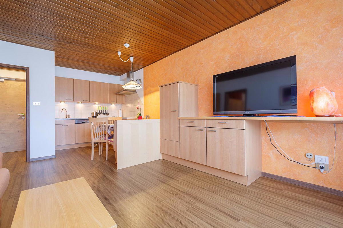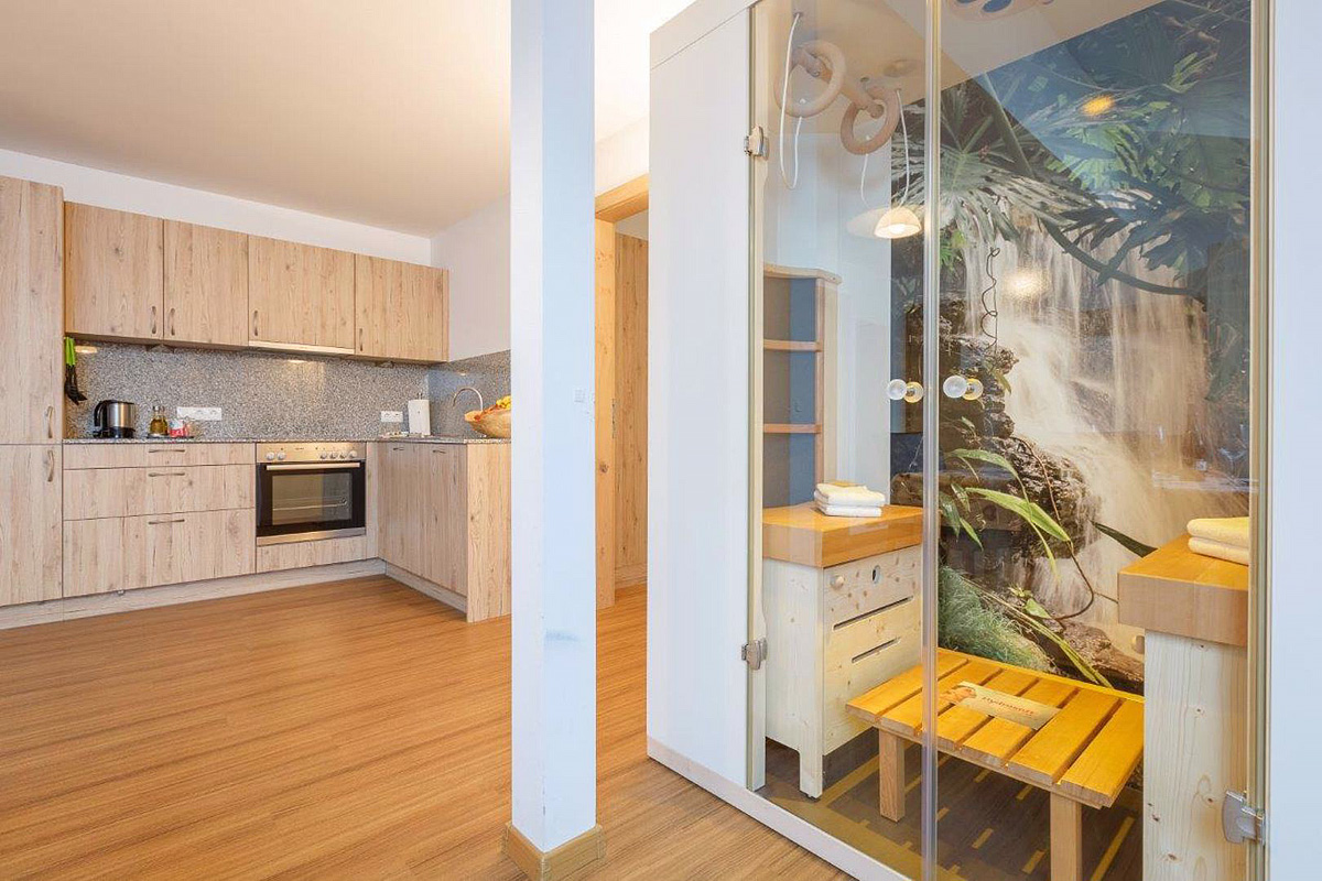 bilo 4 Premium Wellness - 65 m² - 1 ložnice s manželskou postelí, obývací pokoj s kuchyňským koutem, rozkládacím gaučem pro 2 osoby a privátní saunou Hydrosoft Private Spa, sociální zařízení, balkon; apartmány jsou po kompletní rekonstrukci