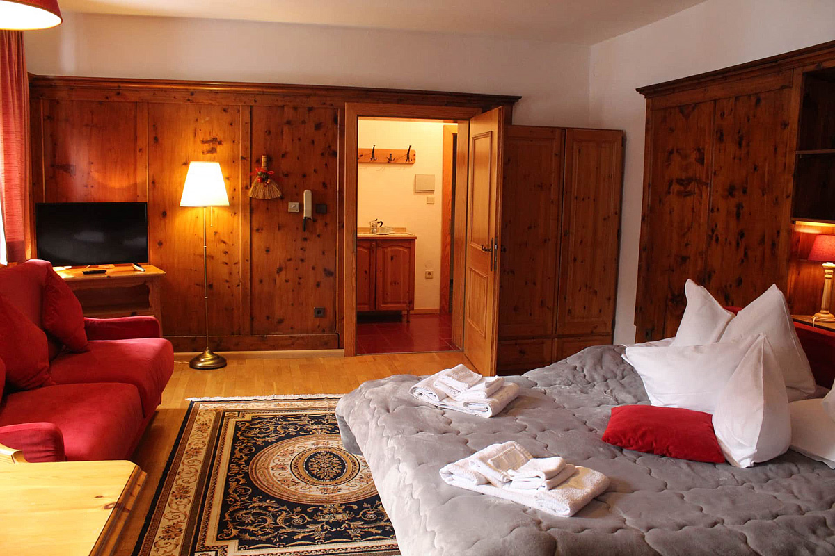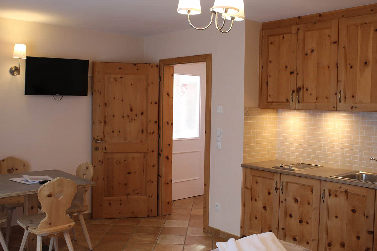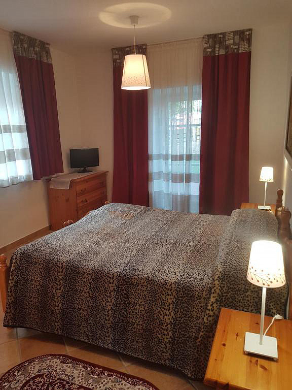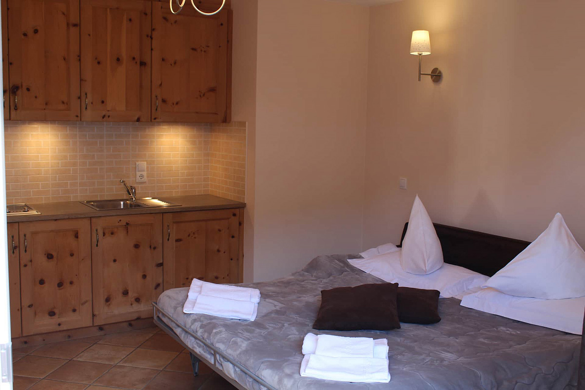 45 m² – 1 ložnice s manželskou postelí, obývací pokoj s malým kuchyňským koutem a rozkládacím gaučem pro 2 osoby, sociální zařízení