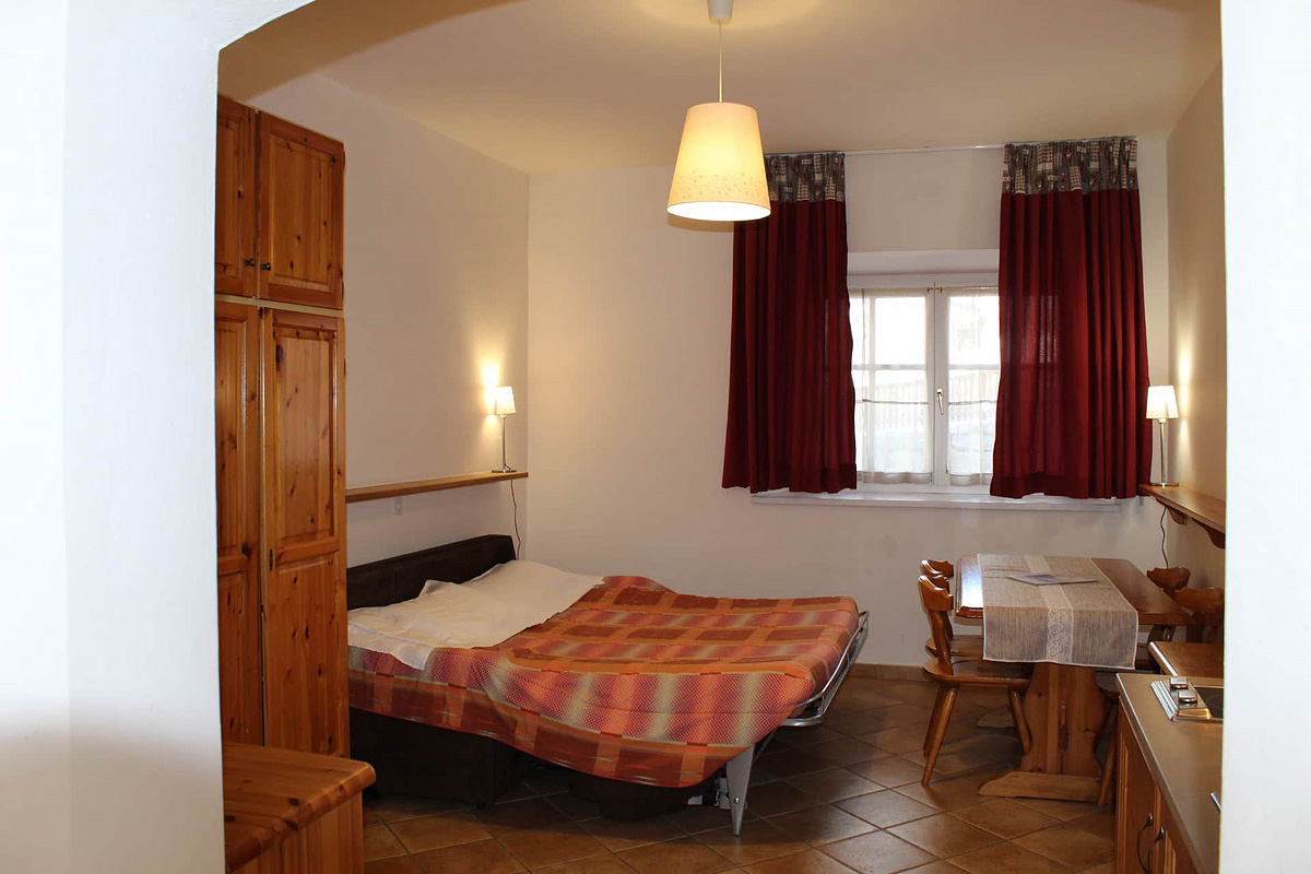 40 m² – obývací pokoj s malým kuchyňským koutem a 2 rozkládacími gauči pro 2 osoby, sociální zařízení