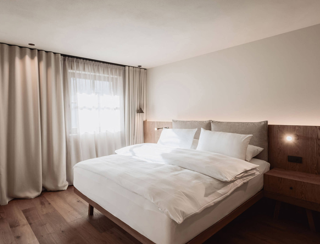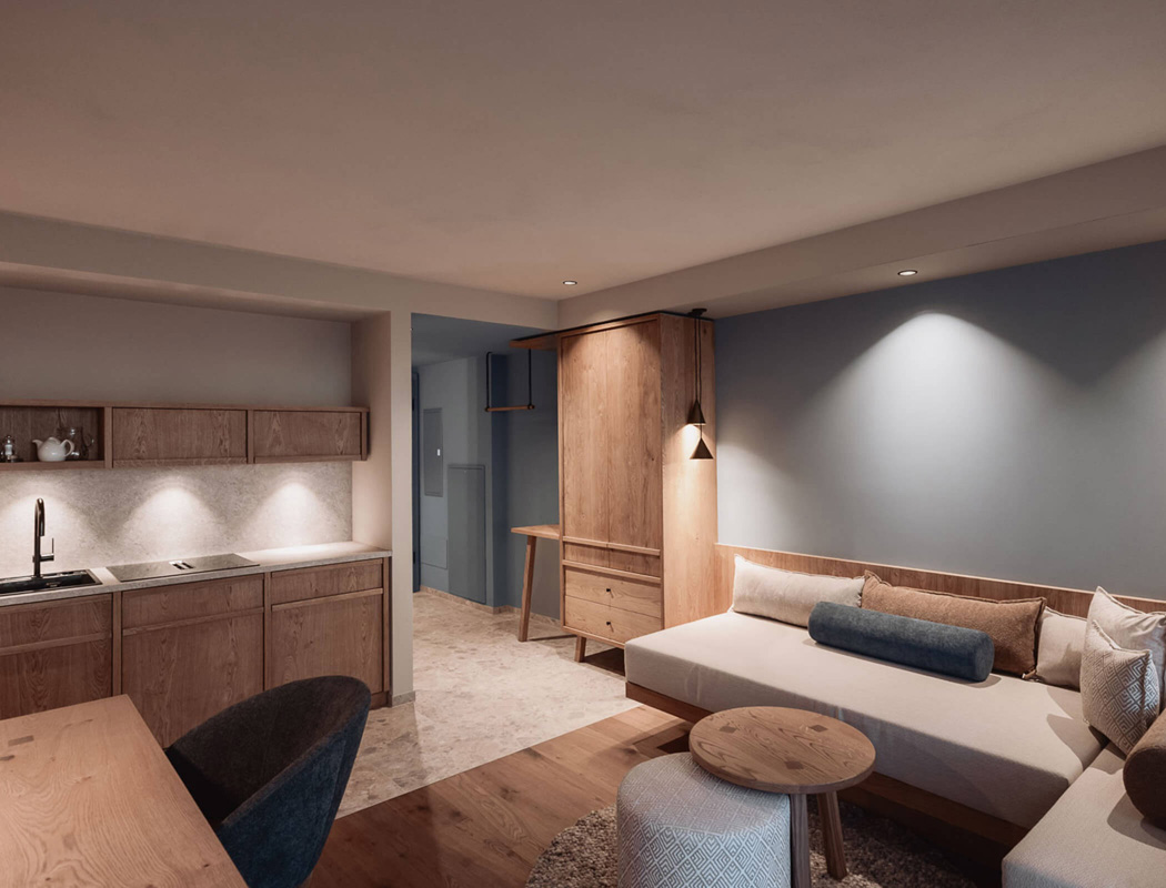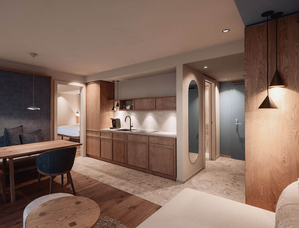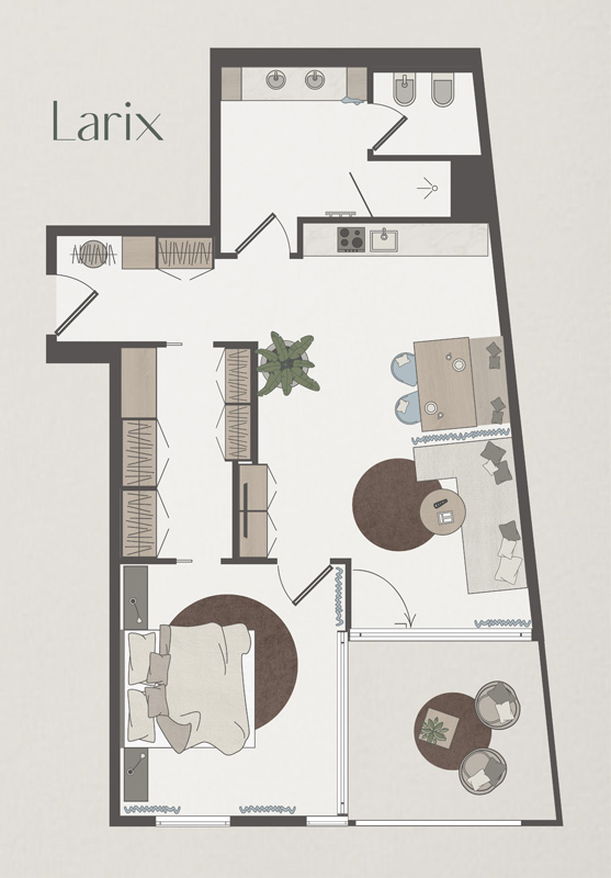 bilo 3+1 Suite Larix - 75 m² - 1 ložnice s manželskou postelí, obývací pokoj s kuchyňským koutem, rozkládacím gaučem (boxspring) pro 1 osobu a případně přistýlkou, sociální zařízení se sprchou, balkon; maximální obsazenost apartmánu jsou 3 dospělé osoby a 1 dítě do nedovršených 18 let; uvedená plocha je včetně balkonu