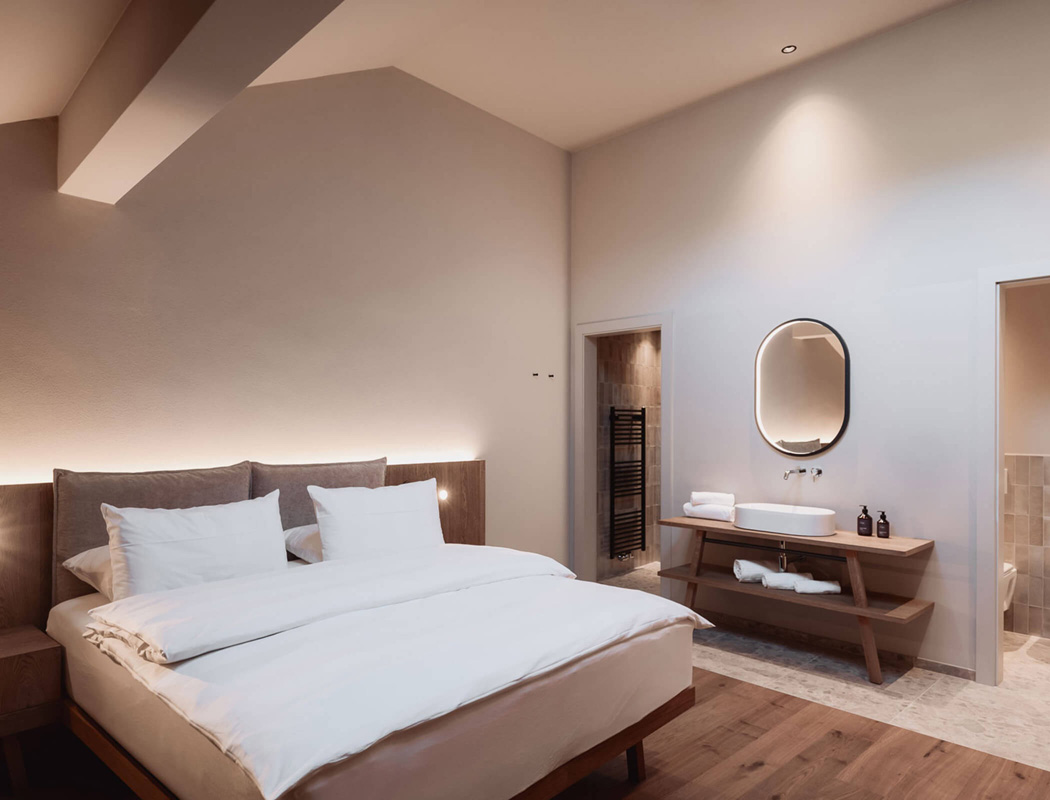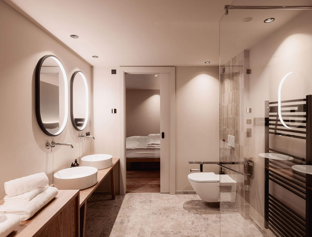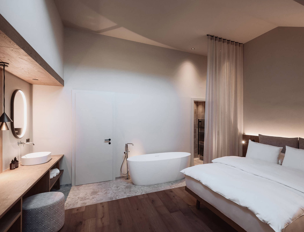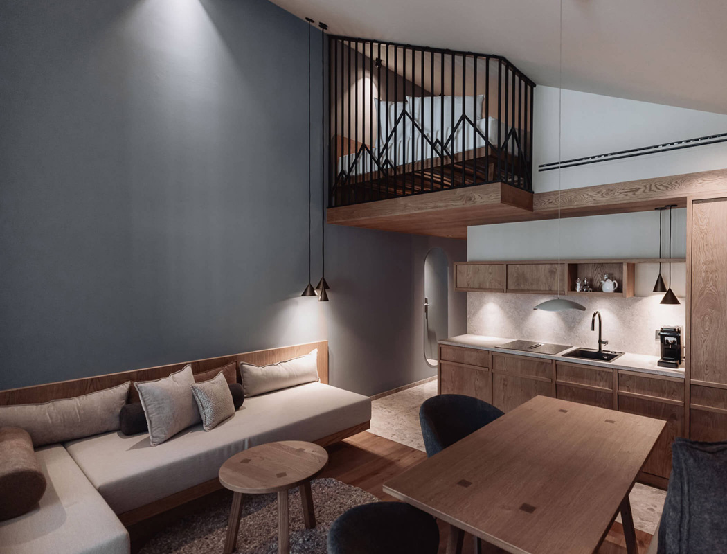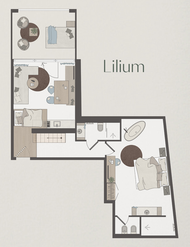 bilo 3+2 Rooftop Suite Lilium - 80 m² - 1. podlaží apartmánu: 1 ložnice s manželskou postelí, samostatnou vanou a případně přistýlkou, obývací pokoj s kuchyňským koutem a rozkládacím gaučem (boxspring) pro 1 osobu, sociální zařízení se sprchou, balkon; 2 podlaží apartmánu: vyvýšené neuzavřené patro s 1 samostatným lůžkem pro 1 dospělou osobu či 2 děti; maximální obsazenost apartmánu jsou 3 dospělé osoby a 2 děti do nedovršených 18 let; uvedená plocha je včetně balkonu