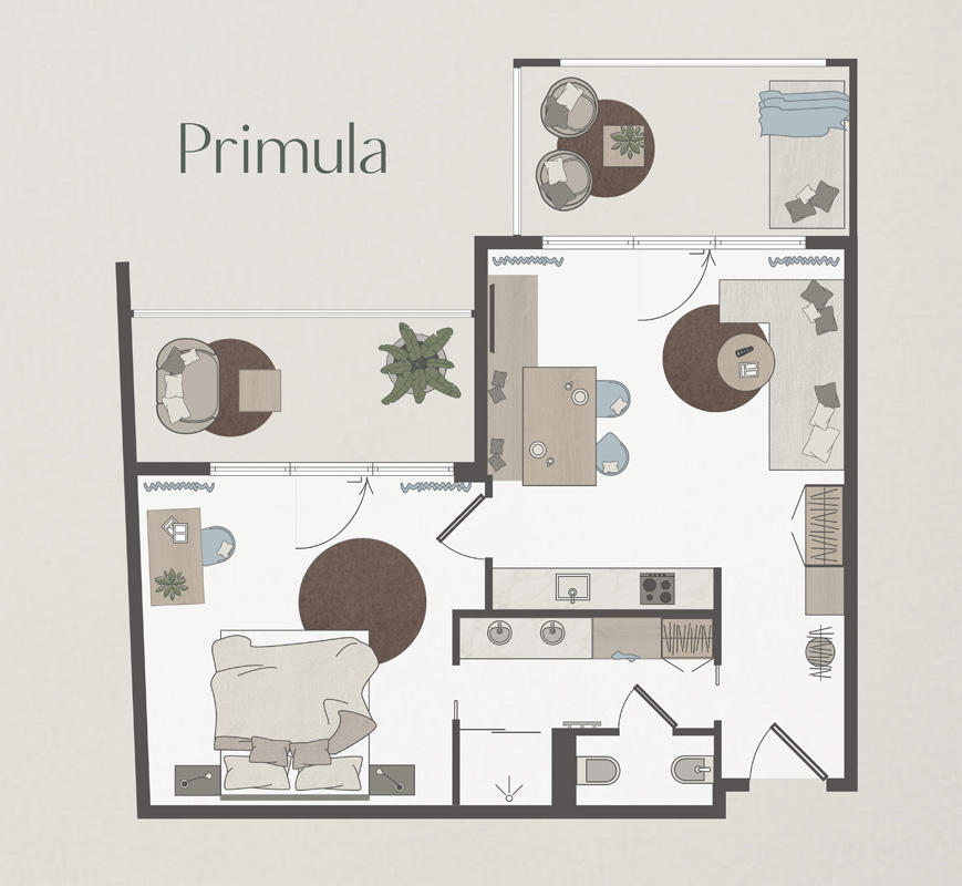 bilo 3+1 Park Suite Primula - 50 m² - 1 ložnice s manželskou postelí, obývací pokoj s kuchyňským koutem, rozkládacím gaučem (boxspring) pro 1 osobu a případně přistýlkou, sociální zařízení se sprchou, 2 balkon; maximální obsazenost apartmánu jsou 3 dospělé osoby a 1 dítě do nedovršených 18 let; uvedená plocha je včetně balkonů