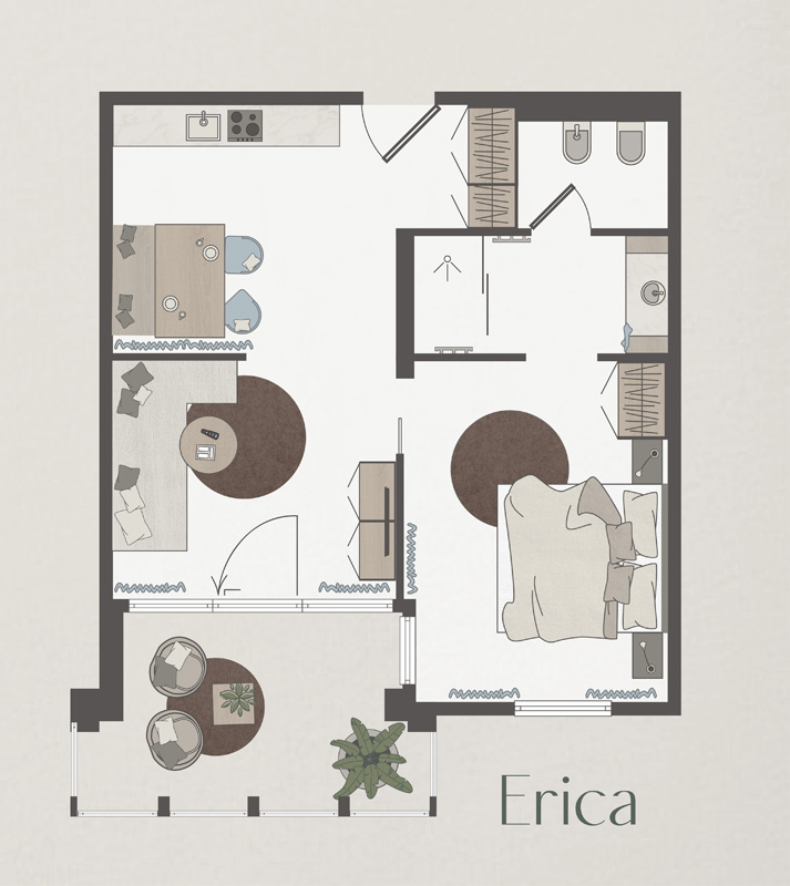 bilo 2+1 Arch Suite Erica - 60 m - 1 ložnice s manželskou postelí, obývací pokoj s kuchyňským koutem a rozkládacím gaučem (boxspring) pro 1 osobu, sociální zařízení se sprchou, balkon či terasa; maximální obsazenost apartmánu jsou 2 dospělé osoby a 1 dítě do nedovršených 18 let; uvedená plocha je včetně balkonu / terasy