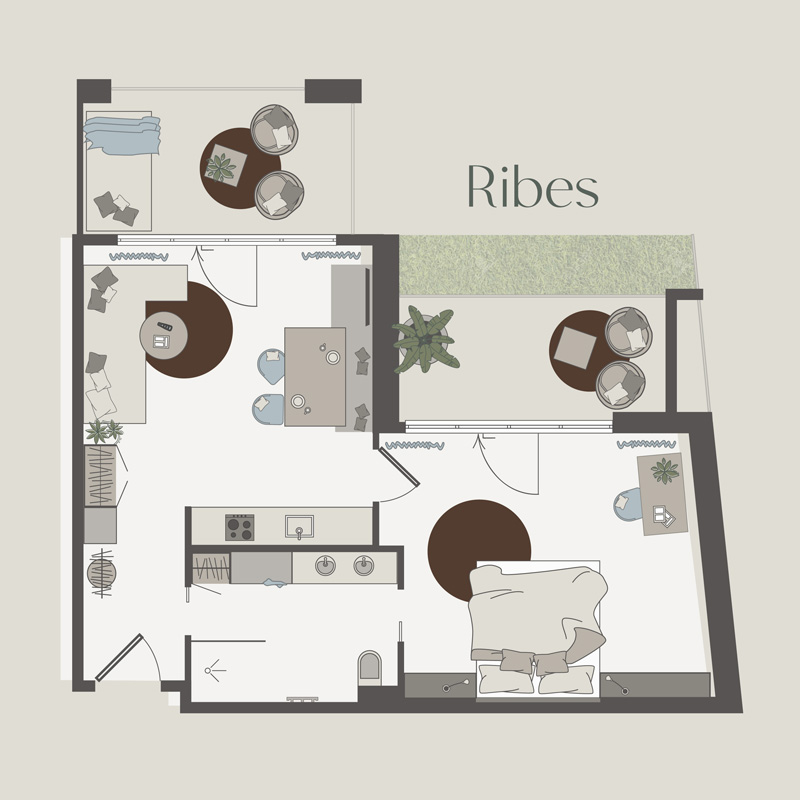 bilo 2+1 Garden Suite Ribes - 65 m² - 1 ložnice s manželskou postelí, obývací pokoj s kuchyňským koutem a rozkládacím gaučem (boxspring) pro 1 osobu, sociální zařízení se sprchou, komora se šatnou, 2x terasa; maximální obsazenost apartmánu jsou 2 dospělé osoby a 1 dítě do nedovršených 18 let; uvedená plocha je včetně teras