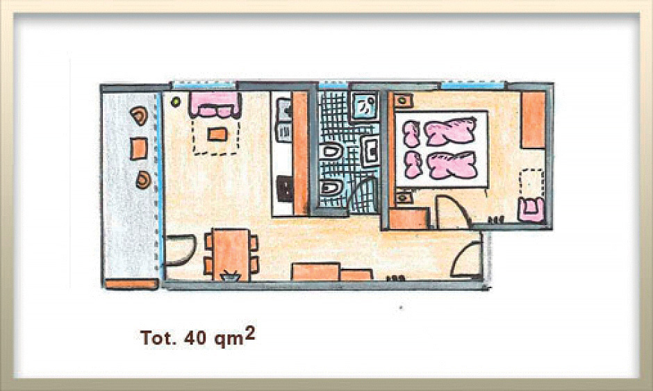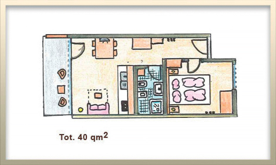 40 m² - 1 ložnice s manželskou postelí, obývací pokoj s kuchyňským koutem a rozkládacím gaučem pro 2 osoby, sociální zařízení, balkon
