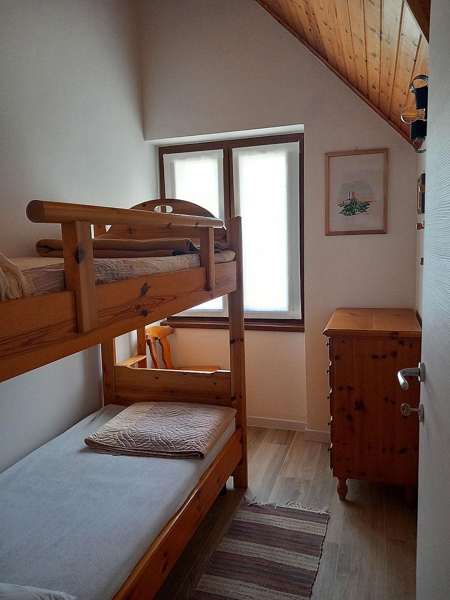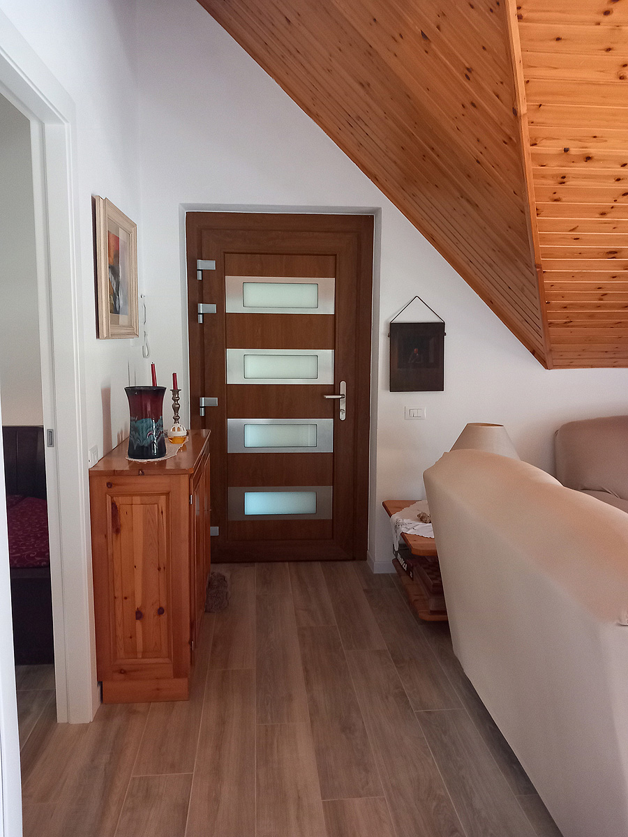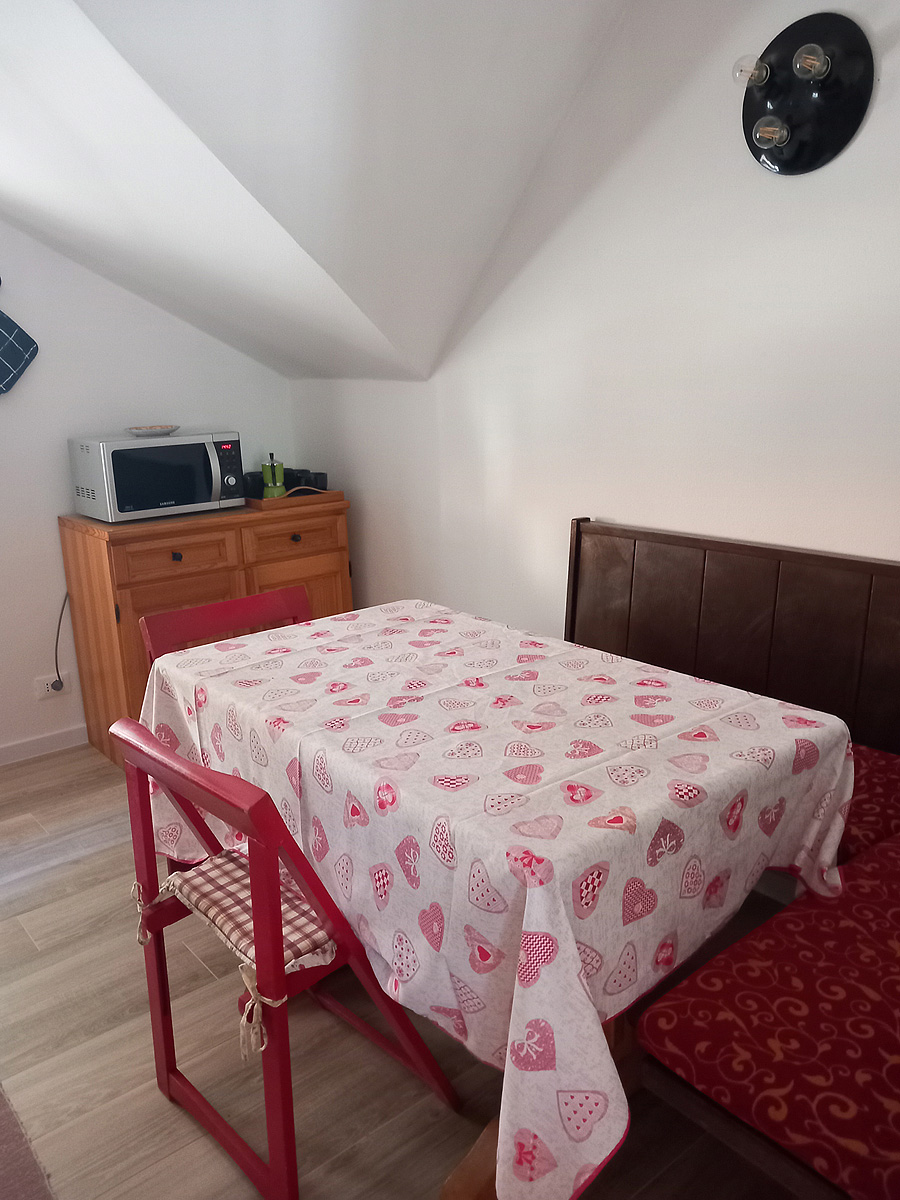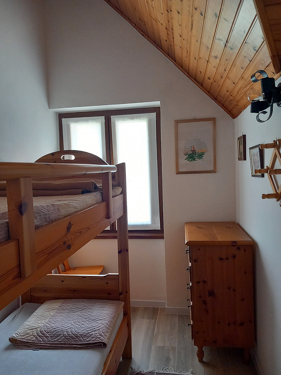 1 ložnice s manželskou postelí, 1 malá ložnice s palandou, obývací pokoj s 2 gauči (nikoliv pro spaní) a krbem (nelze používat), kuchyňka, sociální zařízení se sprchou, balkon; apartmán je situován v 1. patře v podkroví a má částečně zkosené stropy