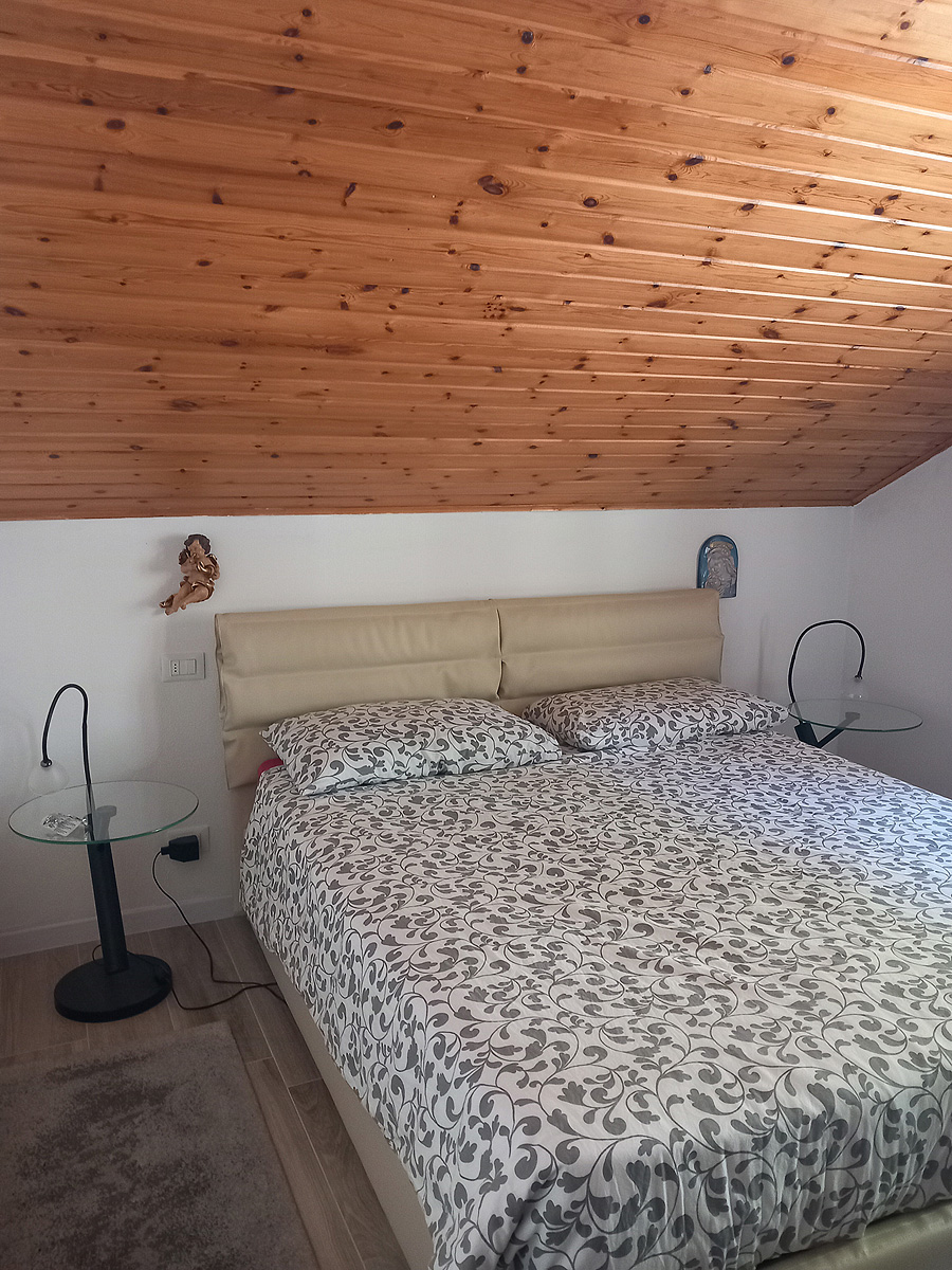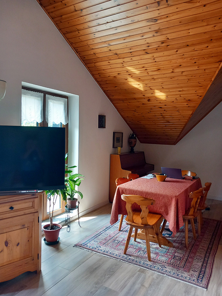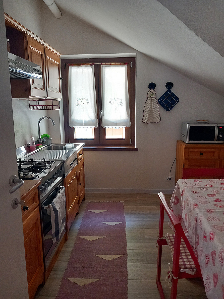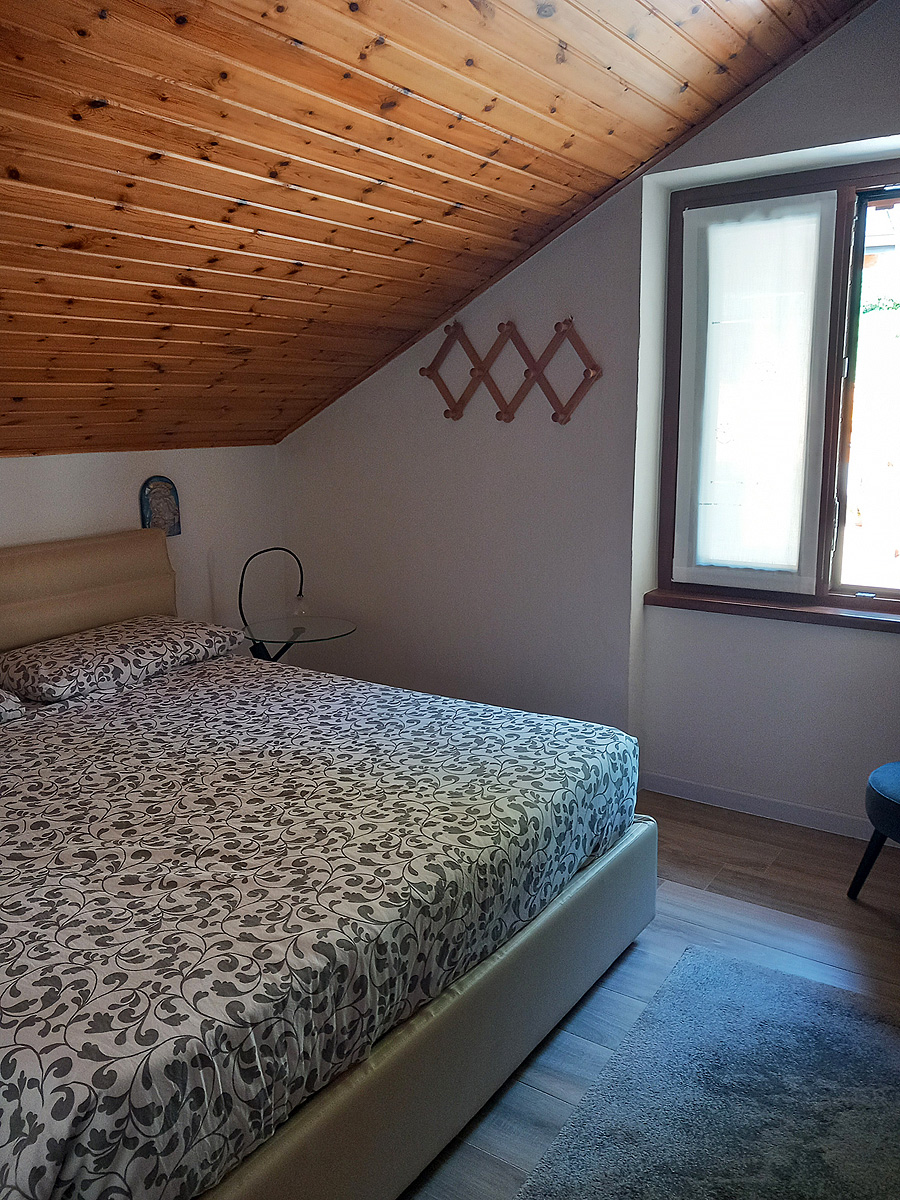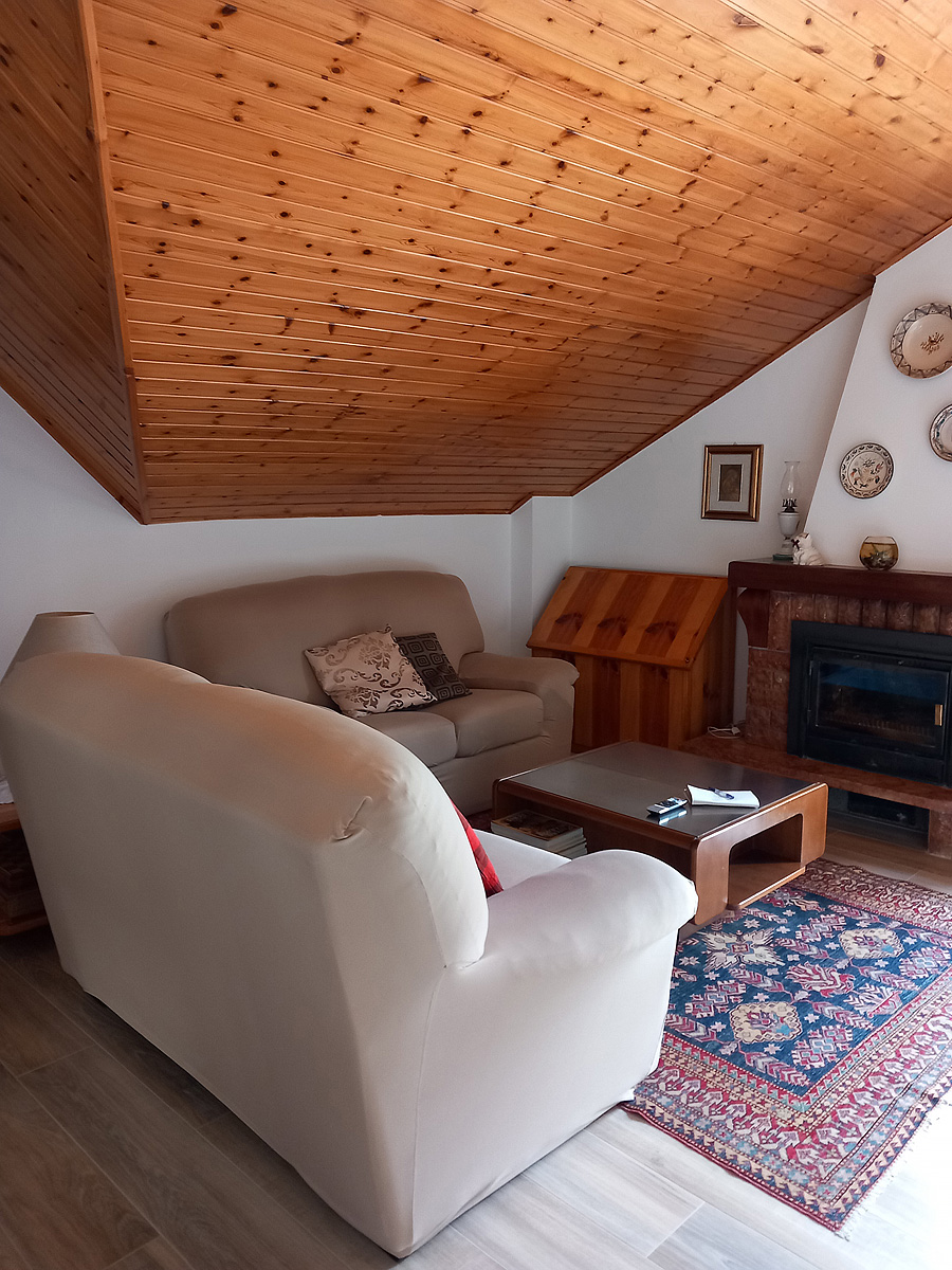 1 ložnice s manželskou postelí, 1 malá ložnice s palandou, obývací pokoj s 2 gauči (nikoliv pro spaní) a krbem (nelze používat), kuchyňka, sociální zařízení se sprchou, balkon; apartmán je situován v 1. patře v podkroví a má částečně zkosené stropy