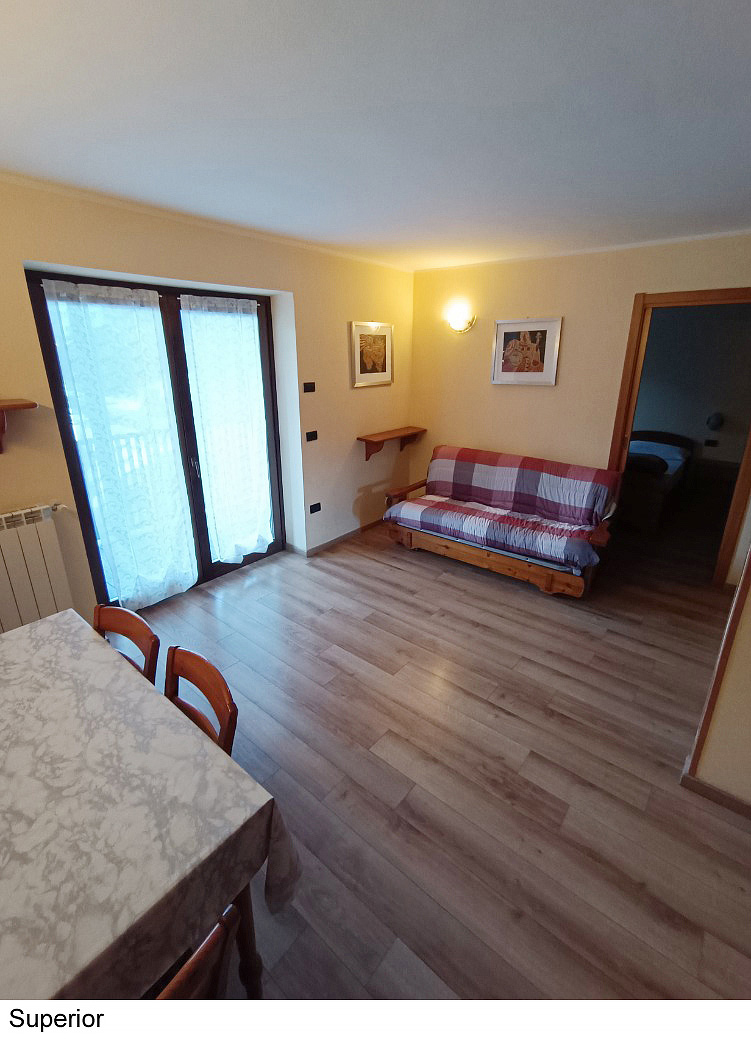 40 m² - 1. podlaží apartmánu: obývací pokoj s kuchyňským koutem a rozkládacím gaučem pro 2 osoby, nově zrekonstruované sociální zařízení, balkon; 2. podlaží apartmánu: 1 ložnice s manželskou postelí a skříňovým rozkládacím lůžkem pro 1 osobu, sociální zařízení (jen umyvadlo či bidet a WC), balkon