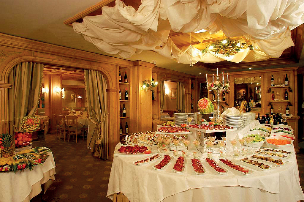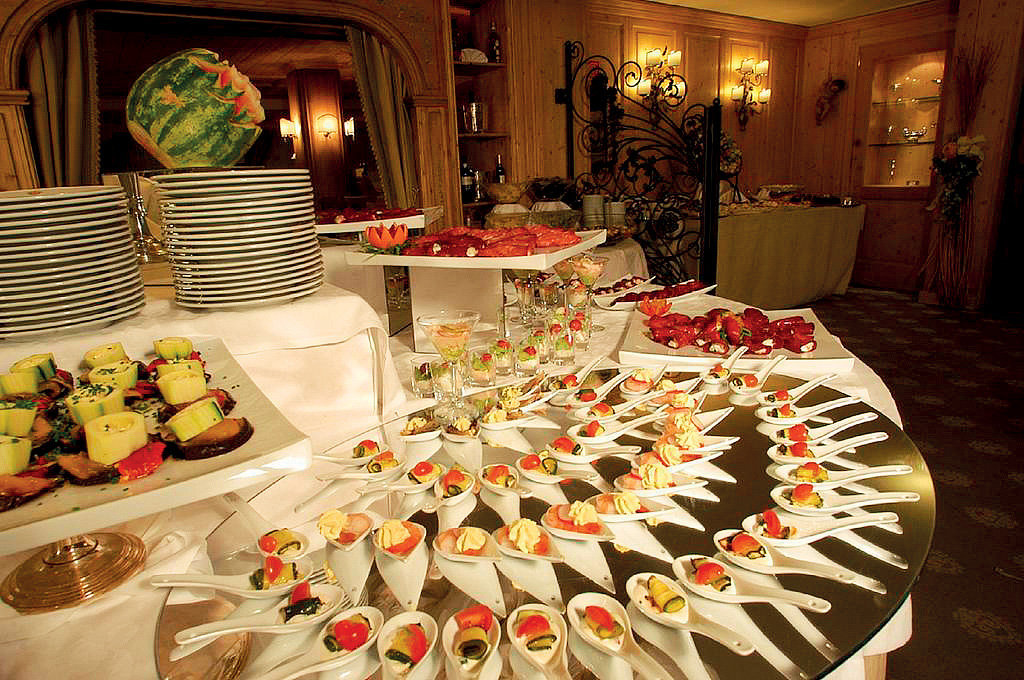 servírované menu s výběrem ze 4 až 5 teplých předkrmů a 4 až 5 hlavních jídel i s možností výběru à la carte, studené předkrmy, přílohy, zelenina, saláty, dezerty, ovoce a sýry formou bohatého bufetu, nápoje za poplatek; 1x týdně slavnostní večeře s jednotným menu; u večeře je vítán společenský oděv