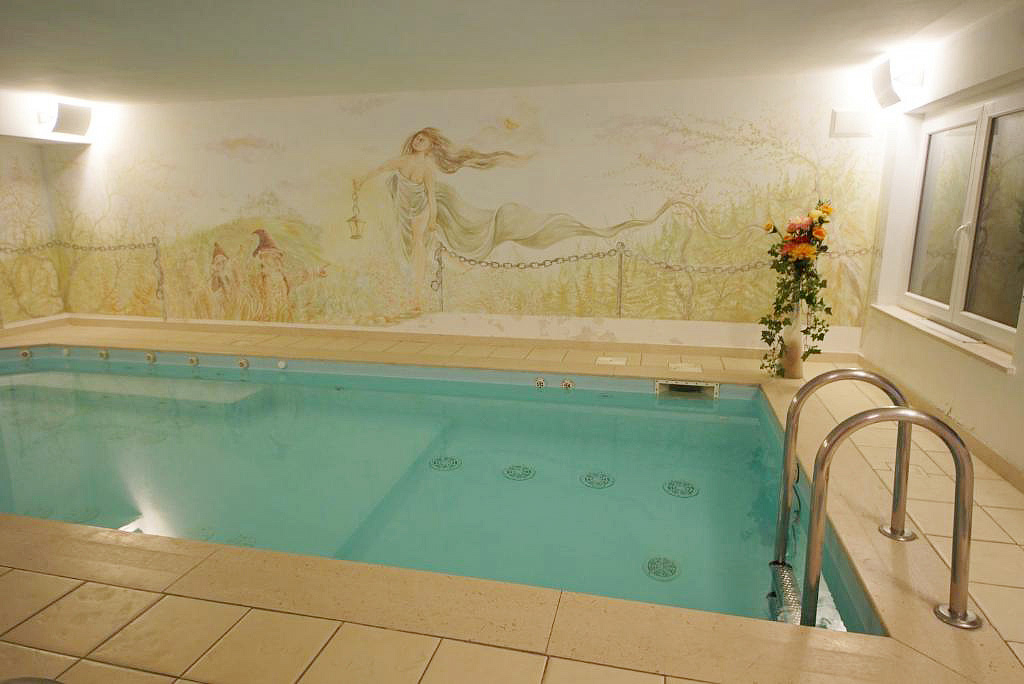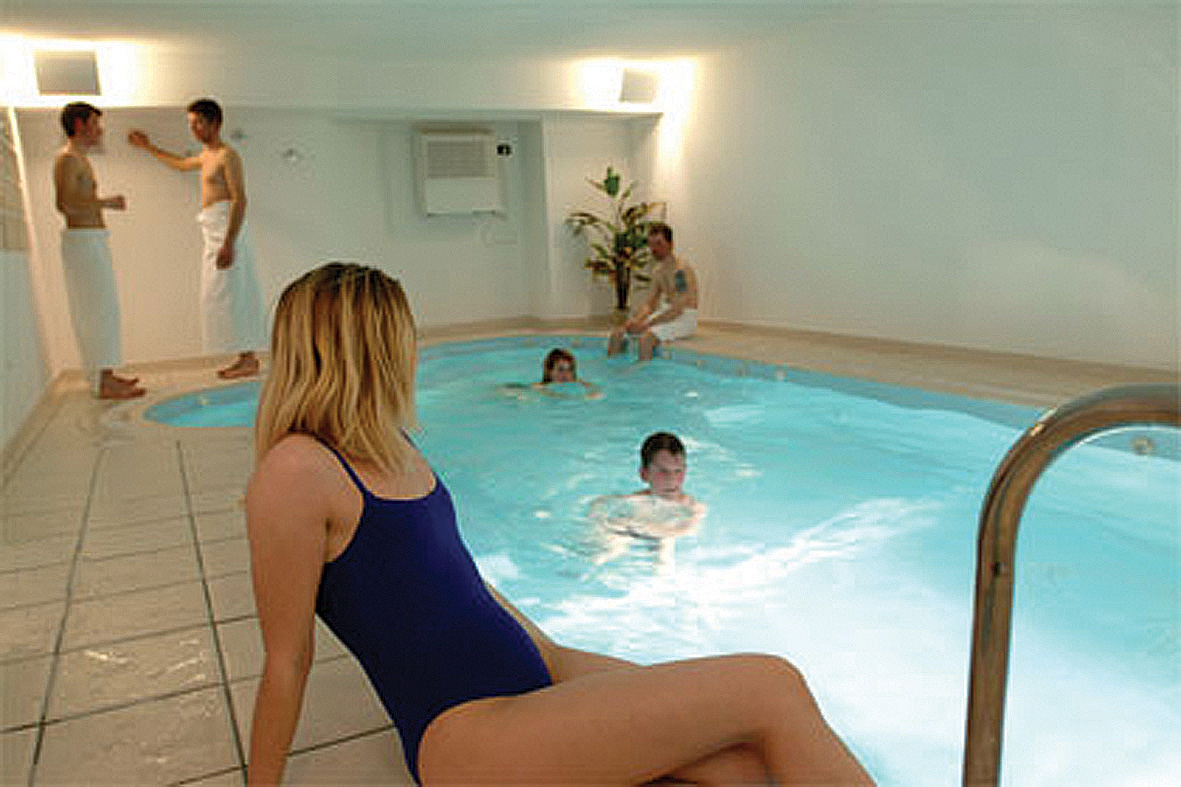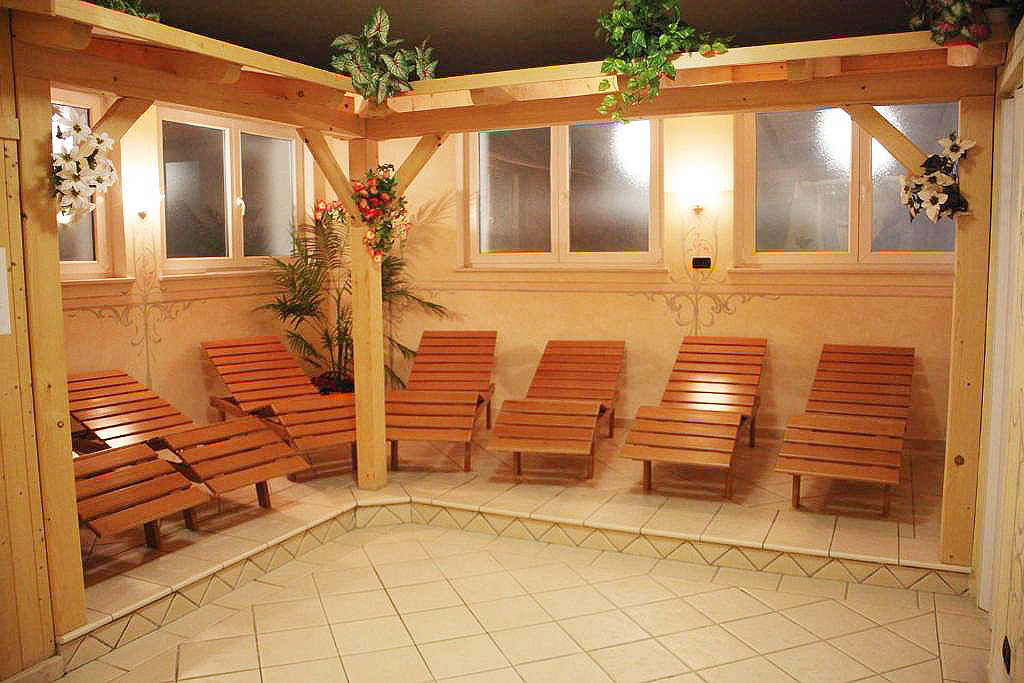 minibazén 6 x 2,5 m s hydromasážními režimy, sauna, pára, solárium*, relaxační koutek s lehátky, posilovací koutek se 2 posilovacími stroji