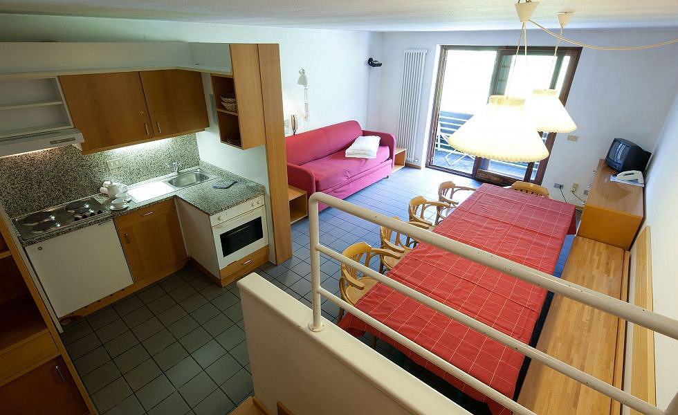 80 m² - 1. podlaží apartmánu - 1 ložnice se skříňovou palandou, sociální zařízení, balkon; 2. podlaží apartmánu - 1 ložnice s manželskou postelí, 1 ložnice se skříňovou palandou, obývací pokoj s kuchyňským koutem a rozkládacím gaučem pro 2 osoby, sociální zařízení, 2x balkon