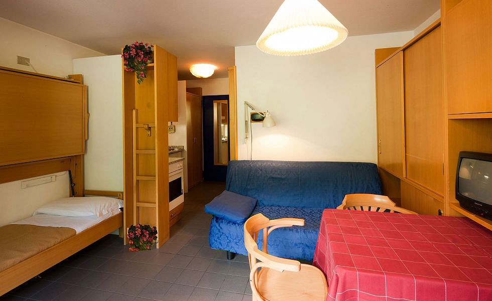 27 m² - obývací pokoj s kuchyňským koutem, rozkládacím gaučem pro 2 osoby a skříňovou palandou, sociální zařízení, balkon či terasa