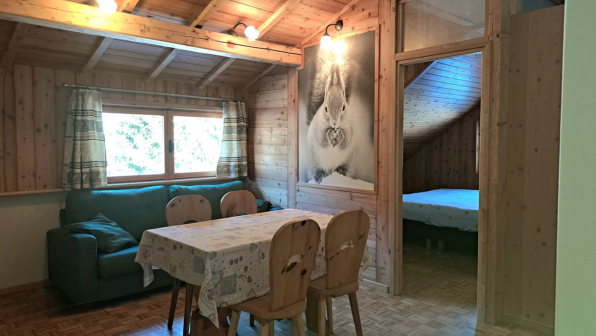 35 - 40 m² - 1 ložnice s manželskou postelí s oddělitelnými lůžky, obývací pokoj s kuchyňským koutem a palandou o délce 180 cm či rozkládacím gaučem pro 1 či 2 osoby, sociální zařízení; apartmány jsou situovány v podkroví
