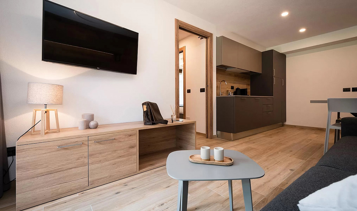 43 m² - 1 ložnice s manželskou postelí, obývací pokoj s kuchyňským koutem a rozkládacím gaučem pro 2 osoby, sociální zařízení zpravidla se sprchou, balkon; některé apartmány se nachází v přízemí s předzahrádkou