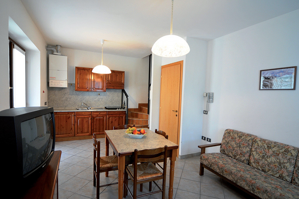 55 m² - 1. podlaží apartmánu: 1 ložnice s manželskou postelí, obývací pokoj s kuchyňským koutem, sociální zařízení, terasa; 2. podlaží apartmánu: 1 ne zcela uzavřená ložnice se 2 či 3 samostatnými lůžky a případně přistýlkou