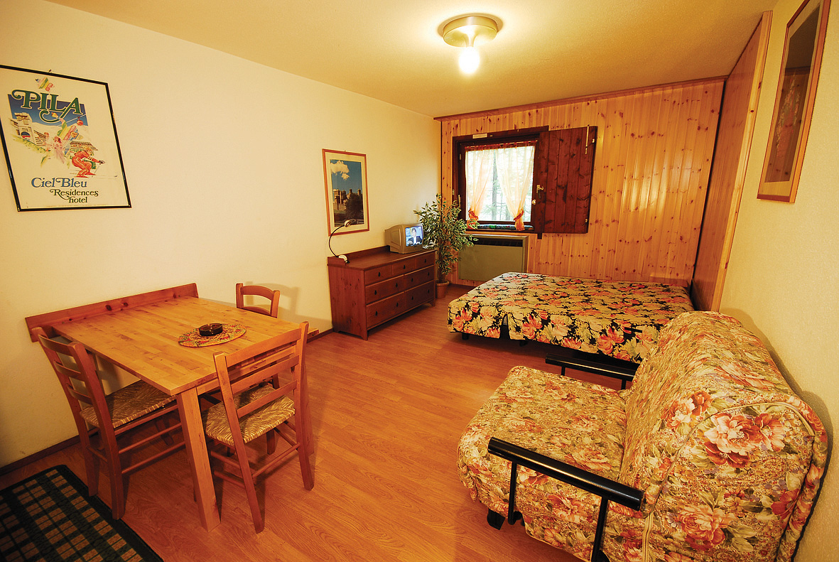 40 m² - 1 ložnice s rozkládacím gaučem typu "šuplík" pro 2 osoby, 1 malá ložnice bez okna s 1 samostatným lůžkem (může být oddělena závěsem či shrnovacími dveřmi), obývací pokoj s rozkládacím gaučem pro 2 osoby (možno i typ "šuplík"), samostatná kuchyňka, sociální zařízení