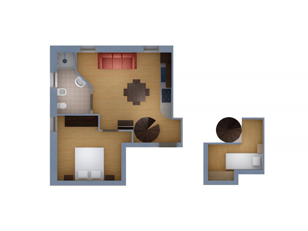 45 m² - 1. podlaží apartmánu: 1 ložnice s manželskou postelí, obývací pokoj s kuchyňským koutem, sociální zařízení; 2. podlaží apartmánu – neuzavřené patro s 1 samostatným lůžkem