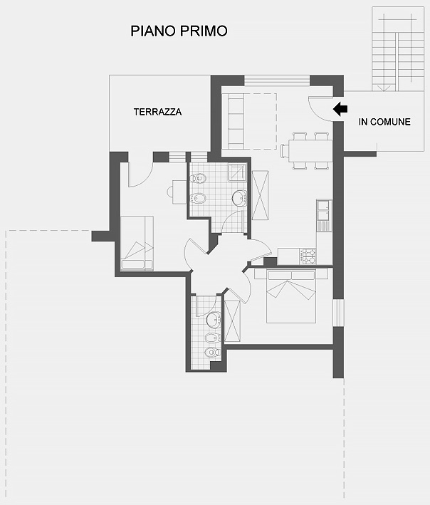 60 až 65 m² - 1 ložnice s manželskou postelí, 1 ložnice s palandou a 1 samostatným lůžkem, obývací pokoj s kuchyňským koutem a rozkládacím gaučem pro 2 osoby, sociální zařízení se sprchou, 1x samostatné WC, balkon či terasa; případně varianta: 1 ložnice s manželskou postelí, 1 ložnice s palandou a 1 lůžkem ve formě "šuplíku", obývací pokoj s kuchyňským koutem, neuzavřené zvýšené patro v podkroví v rámci obývacího pokoje s rozkládacím gaučem pro 2 osoby, sociální zařízení se sprchou, balkon