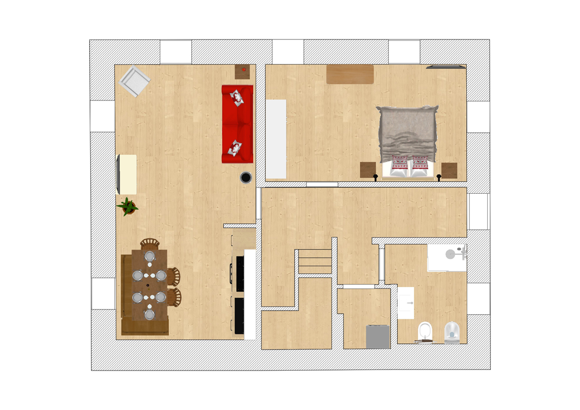 60 m² - 1 ložnice s manželskou postelí, obývací pokoj s kuchyňským koutem a rozkládacím gaučem pro 2 osoby, sociální zařízení; apartmán je situován v přízemí