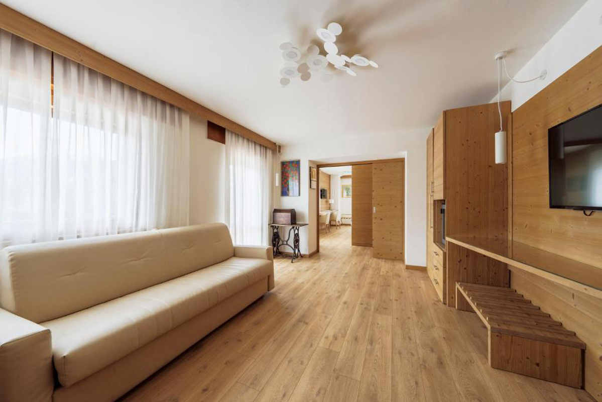 60 m² - 1 ložnice s manželskou postelí, 1 ložnice s mimoúrovňovou palandou či 2 samostatnými lůžky, obývací pokoj s kuchyňským koutem a gaučem, 2x sociální zařízení ( u jednoho apartmánu 1x s vanou a 1x sprchou, u druhého apartmánu 2x s vanou); celkem 2 apartmány jsou situovány v těsně sousedící budově vzdálené cca 80m