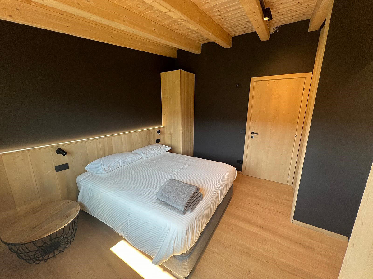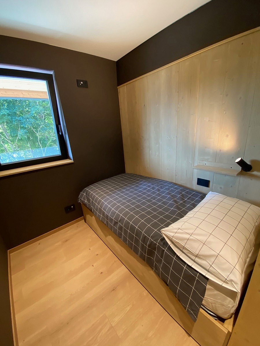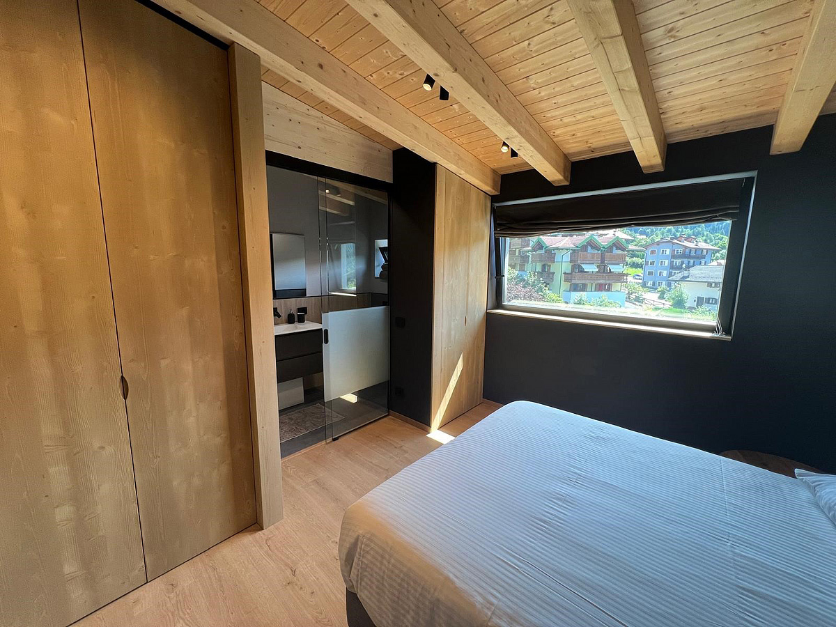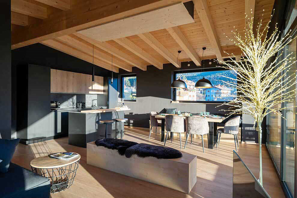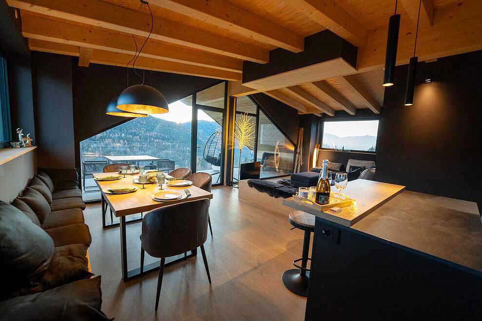 100 m² - 1. ložnice s manželskou postelí, 2. ložnice se 2 samostatnými lůžky na způsob mimoúrovňové palandy (o šířce lůžka 90 cm, pohodlná i pro dospělé), obývací pokoj s kuchyňským koutem a rozměrným sedacím prostorem, 2 sociální zařízení zpravidla se sprchou (1 přináležející k manželské ložnici), velká terasa s panoramatickým výhledem; maximální obsazenost apartmánu 5 dospělých a 1 dítě do nedovršených 14 let