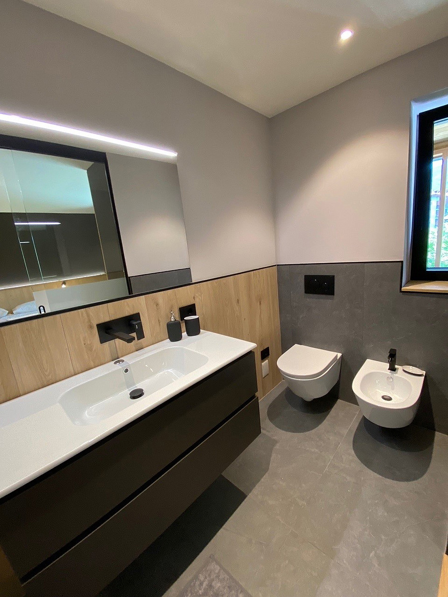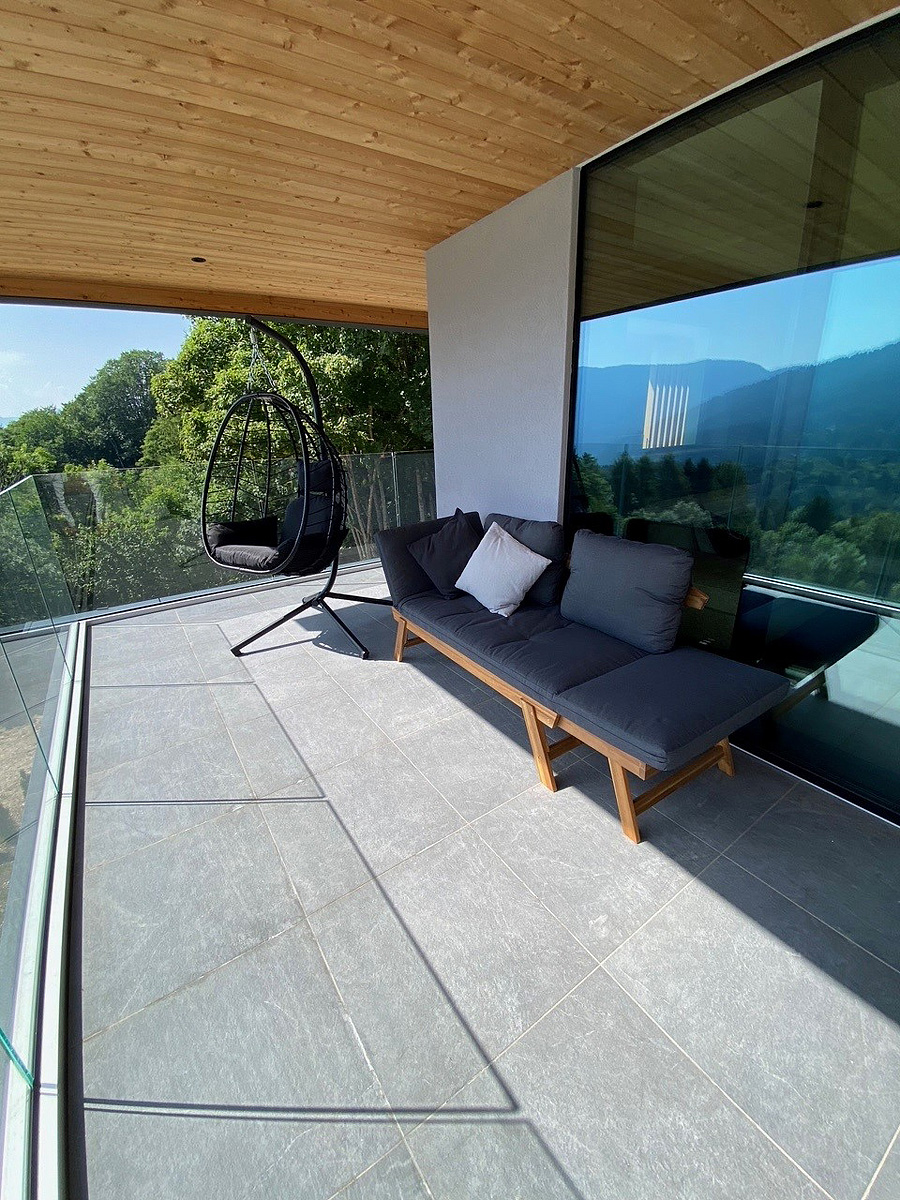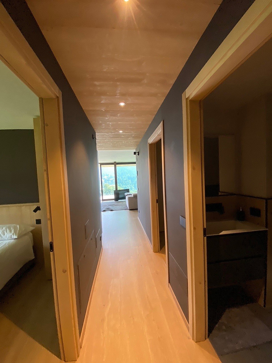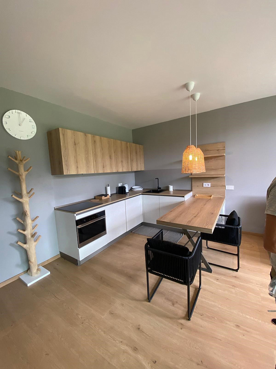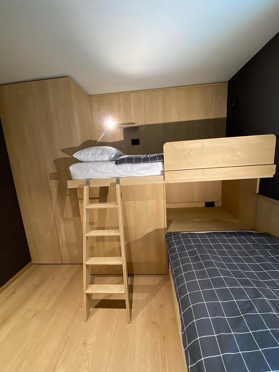 100 m² - 1. ložnice s manželskou postelí, 2. ložnice se 2 samostatnými lůžky na způsob mimoúrovňové palandy (o šířce lůžka 90 cm, pohodlná i pro dospělé), obývací pokoj s kuchyňským koutem a rozměrným sedacím prostorem, 2 sociální zařízení zpravidla se sprchou (1 přináležející k manželské ložnici), velká terasa s panoramatickým výhledem; maximální obsazenost apartmánu 5 dospělých a 1 dítě do nedovršených 14 let