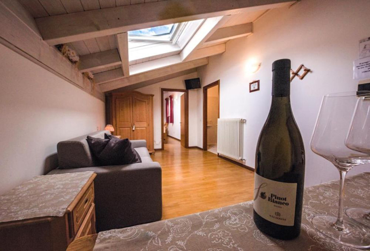 60 m² - 1 ložnice s manželskou postelí, obývací pokoj s kuchyňským koutem a rozkládacím gaučem pro 1-2 osoby, sociální zařízení se sprchou a saunou; maximální obsazenost apartmánu jsou 2 dospělé osoby a 2 děti do nedovršených 12 let
